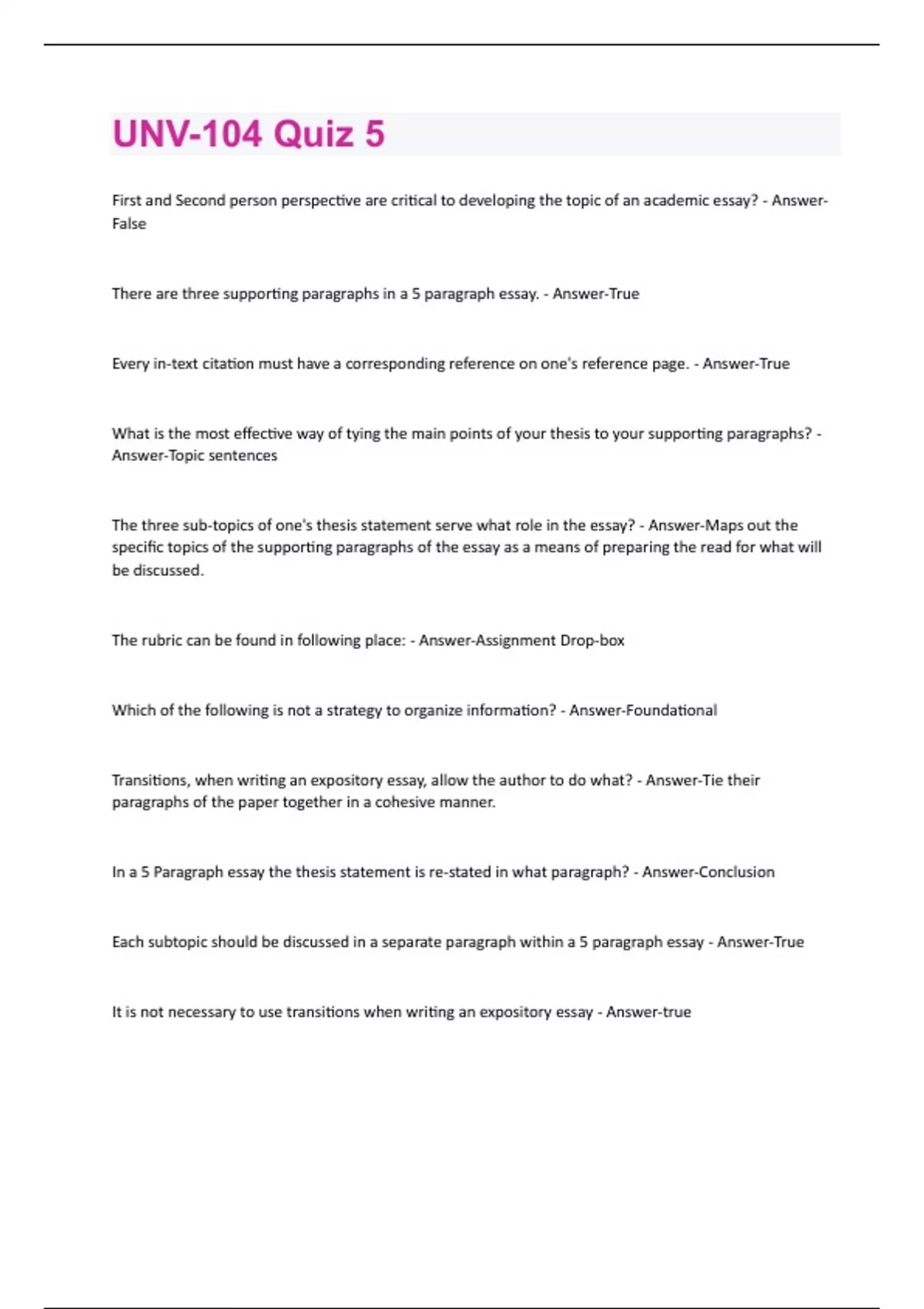 First and Second person perspective are critical to developing the topic of an academic essay? - AnswerFalse There are three supporting paragraphs in a 5 paragraph essay. - Answer-True Every in-text citation must have a corresponding reference on one's reference page. - Answer-True What is the most effective way of tying the main points of your thesis to your supporting paragraphs? - Answer-Topic sentences The three sub-topics of one's thesis statement serve what role in the essay? - Answer-Maps out the specific topics of the supporting paragraphs of the essay as a means of preparing the read for what will be discussed. The rubric can be found in following place: - Answer-Assignment Drop-box Which of the following is not a strategy to organize information? - Answer-Foundational Transitions, when writing an expository essay, allow the author to do what? - Answer-Tie their paragraphs of the paper together in a cohesive manner. In a 5 Paragraph essay the thesis statement is re-stated in what paragraph? - Answer-Conclusion Each subtopic should be discussed in a separate paragraph within a 5 paragraph essay - Answer-True It is not necessary to use transitions when writing an expository essay - Answer-true