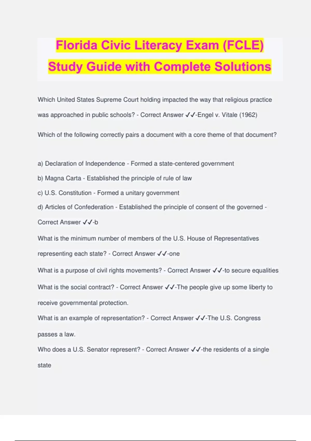 Florida Civic Literacy Exam (FCLE) Study Guide with Complete Solutions