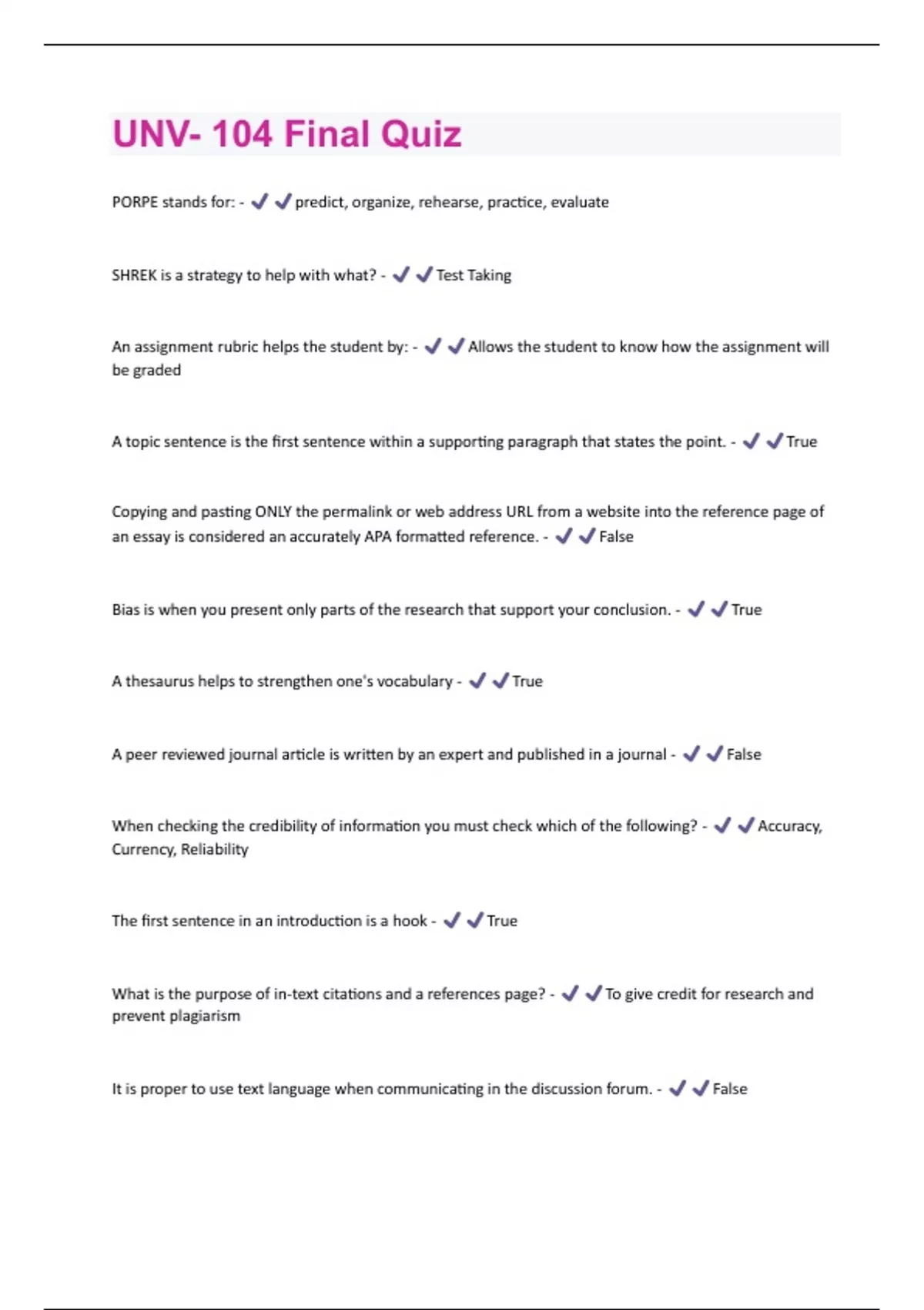 PORPE stands for: - predict, organize, rehearse, practice, evaluate SHREK is a strategy to help with what? - Test Taking An assignment rubric helps the student by: - Allows the student to know how the assignment will be graded A topic sentence is the first sentence within a supporting paragraph that states the point. - True Copying and pasting ONLY the permalink or web address URL from a website into the reference page of an essay is considered an accurately APA formatted reference. - False Bias is when you present only parts of the research that support your conclusion. - True A thesaurus helps to strengthen one's vocabulary - True A peer reviewed journal article is written by an expert and published in a journal - False When checking the credibility of information you must check which of the following? - Accuracy, Currency, Reliability The first sentence in an introduction is a hook - True What is the purpose of in-text citations and a references page? - To give credit for research and prevent plagiarism It is proper to use text language when communicating in the discussion forum. - FalseActive listening is a part of communicating effectively - True Which of the following are types of brainstorming? - Freewriting, mapping, and journalistic questions Accidental and deliberate plagiarism are treated with equal severity. - True It is important to review an assignment rubric before submission. - True Which of the following is an example of an ineffective thesis statement? - You can be successful in school if you try. The thesis statement prepares the reader for what the body paragraphs will be discussing. - True The thesis statement usually appears as the last sentence in the introduction. - True