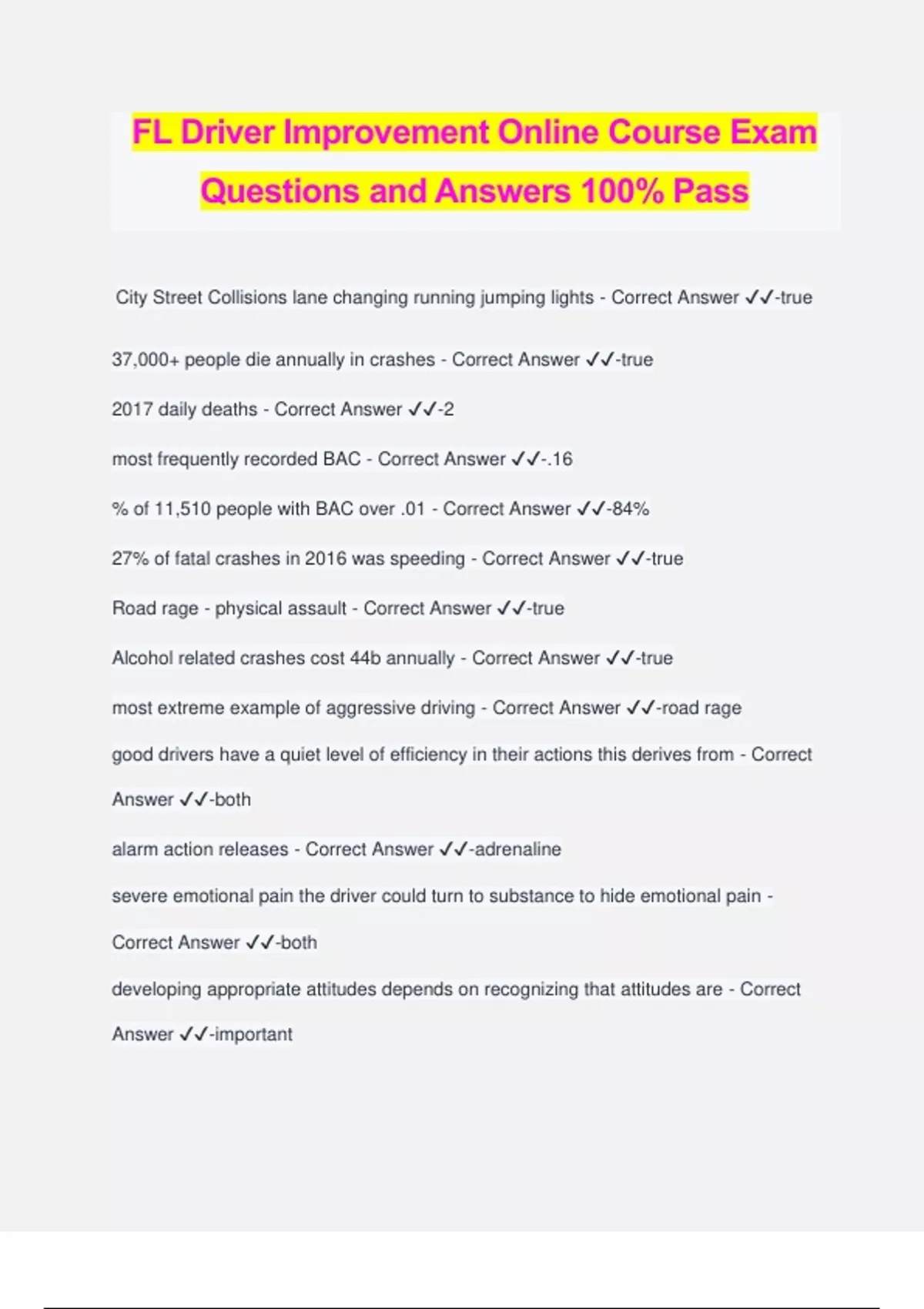 FL Driver Improvement Online Course Exam Questions and Answers 100% Pass City Street Collisions lane changing running jumping lights - Correct Answer ️️ -true 37,000+ people die annually in crashes - Correct Answer ️️ -true 2017 daily deaths - Correct Answer ️️ -2 most frequently recorded BAC - Correct Answer ️️ -.16 % of 11,510 people with BAC over .01 - Correct Answer ️️ -84% 27% of fatal crashes in 2016 was speeding - Correct Answer ️️ -true Road rage - physical assault - Correct Answer ️️ -true Alcohol related crashes cost 44b annually - Correct Answer ️️ -true most extreme example of aggressive driving - Correct Answer ️️ -road rage good drivers have a quiet level of efficiency in their actions this derives from - Correct Answer ️️ -both alarm action releases - Correct Answer ️️ -adrenaline severe emotional pain the driver could turn to substance to hide emotional pain - Correct Answer ️️ -both developing appropriate attitudes depends on recognizing that attitudes are - Correct Answer ️️ -important
