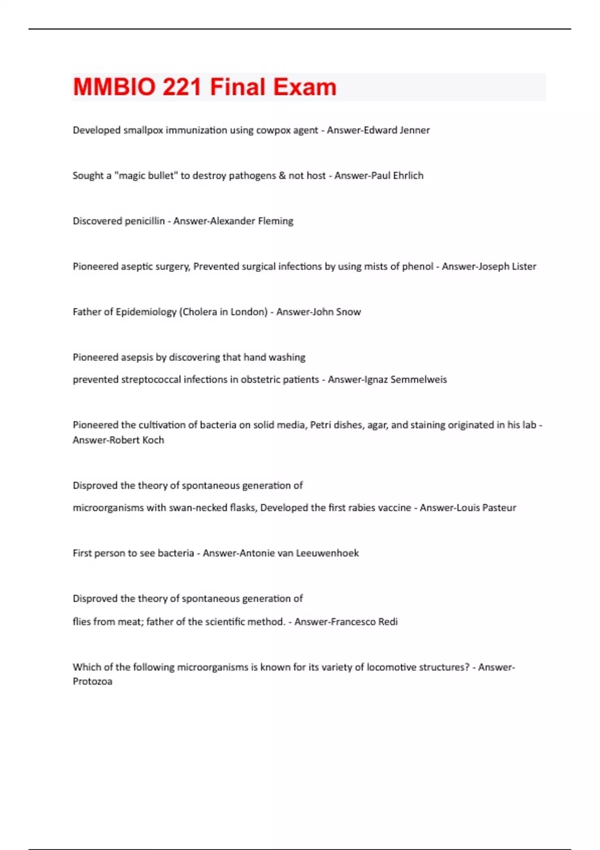 Developed smallpox immunization using cowpox agent - Answer-Edward Jenner Sought a "magic bullet" to destroy pathogens & not host - Answer-Paul Ehrlich Discovered penicillin - Answer-Alexander Fleming Pioneered aseptic surgery, Prevented surgical infections by using mists of phenol - Answer-Joseph Lister Father of Epidemiology (Cholera in London) - Answer-John Snow Pioneered asepsis by discovering that hand washing prevented streptococcal infections in obstetric patients - Answer-Ignaz Semmelweis Pioneered the cultivation of bacteria on solid media, Petri dishes, agar, and staining originated in his lab - Answer-Robert Koch Disproved the theory of spontaneous generation of microorganisms with swan-necked flasks, Developed the first rabies vaccine - Answer-Louis Pasteur First person to see bacteria - Answer-Antonie van Leeuwenhoek Disproved the theory of spontaneous generation of flies from meat; father of the scientific method. - Answer-Francesco Redi Which of the following microorganisms is known for its variety of locomotive structures? - AnswerProtozoaFungi: - Answer-can be yeasts, are eukaryotic, can be molds The person who proposed that all cellular life belongs to one of three domains (Bacteria, Archaea, or Eukarya), based upon rRNA sequences is: - Answer-Carl Woese To which of the following substances would a typical cell membrane be least permeable? - AnswerHydrogen ion (H+) Which of the following organisms are responsible for red tides involved in shellfish poisoning? - AnswerAlgae Short, numerous, non-motile projections used for adherence, Numerous, short bristle-like projections important in biofilms - Answer-Fimbriae Made of tubulin in eukaryotes, Placement can be monotrichous, amphitrichous, or peritrichous - Answer-Flagella Responsible for motility in spirochetes - Answer-Axial filaments Have a central role in conjugation - Answer-Pili