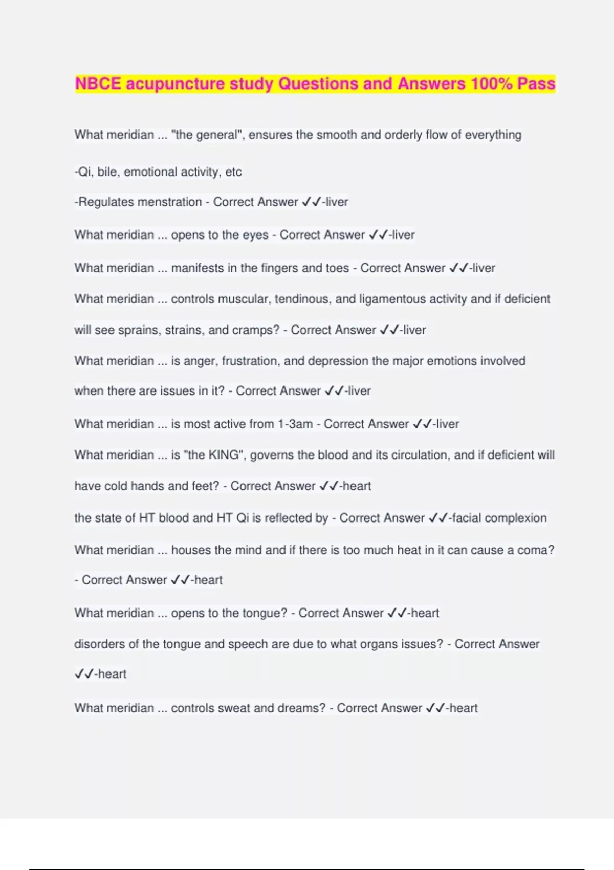 NBCE acupuncture study Questions and Answers 100% Pass What meridian ... "the general", ensures the smooth and orderly flow of everything -Qi, bile, emotional activity, etc -Regulates menstration - Correct Answer ️️ -liver What meridian ... opens to the eyes - Correct Answer ️️ -liver What meridian ... manifests in the fingers and toes - Correct Answer ️️ -liver What meridian ... controls muscular, tendinous, and ligamentous activity and if deficient will see sprains, strains, and cramps? - Correct Answer ️️ -liver What meridian ... is anger, frustration, and depression the major emotions involved when there are issues in it? - Correct Answer ️️ -liver What meridian ... is most active from 1-3am - Correct Answer ️️ -liver What meridian ... is "the KING", governs the blood and its circulation, and if deficient will have cold hands and feet? - Correct Answer ️️ -heart the state of HT blood and HT Qi is reflected by - Correct Answer ️️ -facial complexion What meridian ... houses the mind and if there is too much heat in it can cause a coma? - Correct Answer ️️ -heart What meridian ... opens to the tongue? - Correct Answer ️️ -heart disorders of the tongue and speech are due to what organs issues? - Correct Answer ️️ -heart What meridian ... controls sweat and dreams? - Correct Answer ️️ -heart What meridian ... is most active 11am - 1pm? - Correct Answer ️️ -heart What meridian ... governs the movement and transformation of food and passes all essential Qi from food to SP and the rest to the SI/LI? - Correct Answer ️️ -spleen What meridian ... controls blood, produces and prevents hemorrhage and will always be involved in a blood pathology? - Correct Answer ️️ -spleen What meridian ... governs muscles and limbs? - Correct Answer ️️ -spleen herniations and atrophy think what? - Correct Answer ️️ -ST and SP What meridian ... has strong lifting property? - Correct Answer ️️ -spleen What meridian ... houses the intellect (yi) and digestion of information? - Correct Answer ️️ -spleen What meridian ... is most active from 9am-11am? - Correct Answer ️️ -spleen What meridian ... controls Qi and respiration? - Correct Answer ️️ -lung what channel is affected by worry and grief? - Correct Answer ️️ -lung What meridian ... regulates fluids/controls channels and blood vessels? - Correct Answer ️️ -lung What meridian ... manifests in body hair? - Correct Answer ️️ -lung What meridian ... opens into the nose and controls nasal mucus? - Correct Answer ️️ - lung What meridian ... is most active during 3am-5am? - Correct Answer ️️ -lung Back pain and menstrual problems are often rooted in what channel? - Correct Answer ️️ -kidney What meridian ... is the the foundation of all Yin & Yang and store jing (essence)? - Correct Answer ️️ -kidney