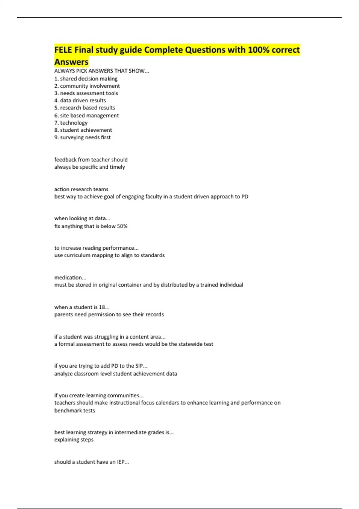 FELE Final study guide Complete Questions with 100% correct Answers ALWAYS PICK ANSWERS THAT SHOW... 1. shared decision making 2. community involvement 3. needs assessment tools 4. data driven results 5. research based results 6. site based management 7. technology 8. student achievement 9. surveying needs first feedback from teacher should always be specific and timely action research teams best way to achieve goal of engaging faculty in a student driven approach to PD when looking at data... fix anything that is below 50% to increase reading performance... use curriculum mapping to align to standards medication... must be stored in original container and by distributed by a trained individual when a student is 18... parents need permission to see their records if a student was struggling in a content area... a formal assessment to assess needs would be the statewide test if you are trying to add PD to the SIP... analyze classroom level student achievement data if you create learning communities... teachers should make instructional focus calendars to enhance learning and performance on benchmark tests best learning strategy in intermediate grades is... explaining steps should a student have an IEP... no peer coaching or exemptions will be made if a student from another country without records wants to enroll... the principal should enroll the student temporarily pending receipt of documentation META Consent Decree addresses civil rights of ELL students and gives them equal access to all education programs 1st Amendment freedom of speech/assembly Hazelwood School District vs Kuhlmeier SC ruled against student because school newspaper was not a public forum Tinker vs Des Moines children have Constitutional rights, but cannot disrupt education Equal Access Act schools cannot deny use of facilities for any political, philosophical, or religious reason 4th Amendment protection from unreasonable search/seizure...search must be specific New Jersey vs TLO no warrant needed to search student, just probable cause Goss vs Lopez allows for due process (student/parent notification within 24 hours, chance to defend themselves) 8th Amendment cruel and unusual punishment Ingraham vs Wright SC ruled that corporal punishment in public schools does not violate 8th Amendment 10th Amendment states have power over public schools Rodriguez vs San Antonio Independent School District funding of education was not a federal issue 14th Amendment provides equal protection Plessy vs Ferguson government must provide separate, but equal facilities Brown vs Board of Education segregation in schools was illegal No Child Left Behind provides new federal funding along with testing requirements, which include criterion-referenced tests and date which will be collected, disaggregated, and publicized AYP adequate yearly progress IDEA Individuals with Disabilities Act a student is re-evaluated... not more than once a year unless the parent and public agency agree. at least has to occur once every three years a parent receives procedural notification... once a year or when parents request an initial evaluation, when a child is referred to the agency, the first time they file a complaint, and whenever the parent requests the notice FAPE free appropriate education in an LRE (least restrictive environment) ESE students can only be suspended for... 10 days 504 plans students must be given accommodation FERPA guarantees parents or eligible students to access the students' records new teachers to a district... have 3 years of probation during he first annual contract a teacher... can be fired within 97 days
