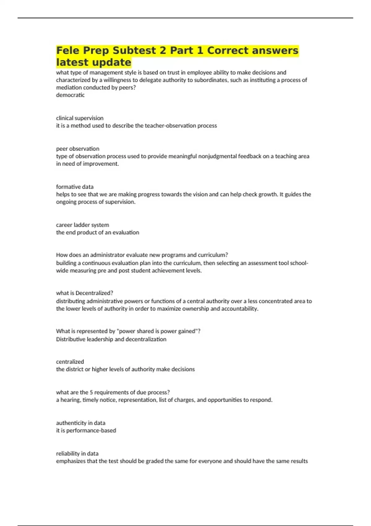 Fele Prep Subtest 2 Part 1 Correct answers latest update