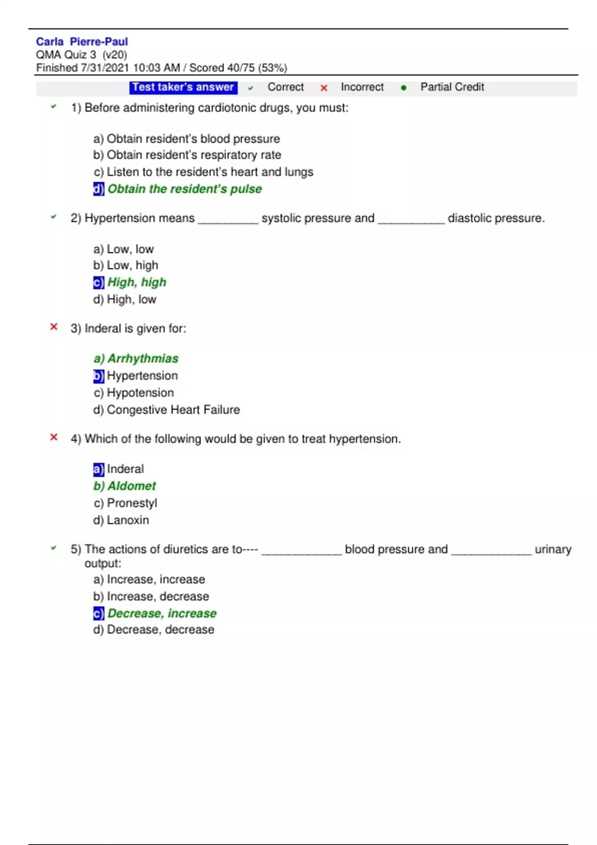 Before administering cardiotonic drugs, you must: a) Obtain resident’s blood pressure b) Obtain resident’s respiratory rate c) Listen to the resident’s heart and lungs d) Obtain the resident’s pulse . a 2) Hypertension means _________ systolic pressure and __________ diastolic pressure. a) Low, low b) Low, high c) High, high d) High, low . r 3) Inderal is given for: a) Arrhythmias b) Hypertension c) Hypotension d) Congestive Heart Failure . r 4) Which o