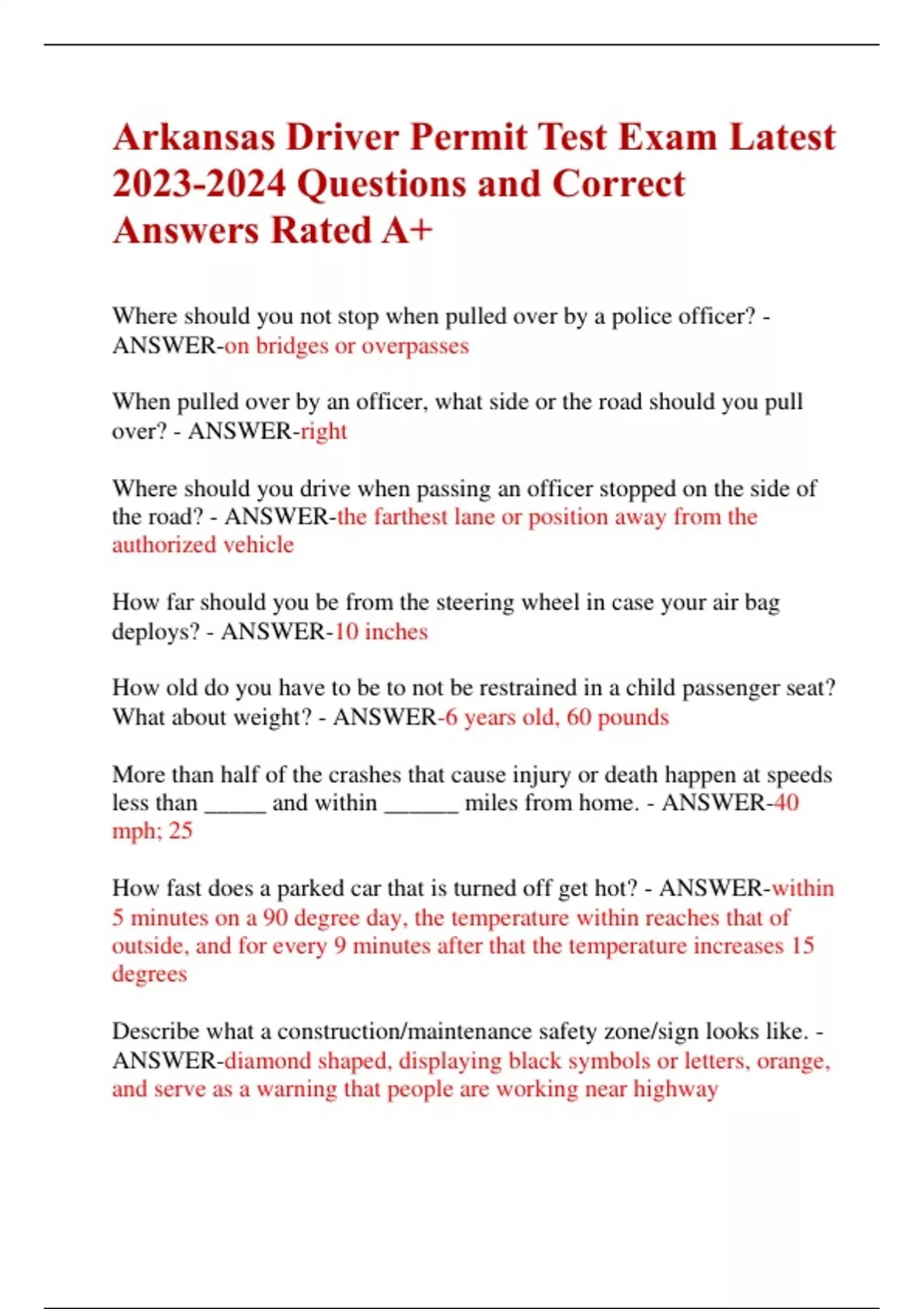 Get Ready to Hit the Road with Confidence: Arkansas Driver Permit Test Exam Latest 2023 PDF! Are you gearing up to obtain your Arkansas driver's permit? Look no further! Prepare yourself for success with the Arkansas Driver Permit Test Exam Latest 2023 PDF – your ultimate guide to mastering the rules of the road! Tailored specifically for aspiring drivers in Arkansas, this comprehensive document covers everything you need to know to pass your driver's permit test with flying colors. Whether you're a new teen driver or an adult seeking to obtain your permit, this meticulously crafted guide is your key to unlocking the freedom of the open road. Why Choose the Arkansas Driver Permit Test Exam Latest 2023 PDF? Comprehensive Coverage: Familiarize yourself with Arkansas's traffic laws, road signs, and safe driving practices through comprehensive coverage of the state's driver's handbook. Practice Questions: Test your knowledge and gauge your readiness with a wide range of practice questions, simulating the format and difficulty level of the actual permit test. Visual Aids: Reinforce your learning with vivid illustrations and diagrams of road signs, signals, and common traffic scenarios, enhancing your understanding and retention of key concepts. Tips and Strategies: Benefit from expert tips and strategies for acing the permit test, including effective study techniques and test-taking strategies to boost your confidence on exam day. Accessible Anywhere, Anytime: Study on your own schedule and at your own pace – access your study material conveniently from your computer, tablet, or smartphone. Proven Success: Join countless individuals who have successfully obtained their Arkansas driver's permit with the help of our trusted exam preparation materials.