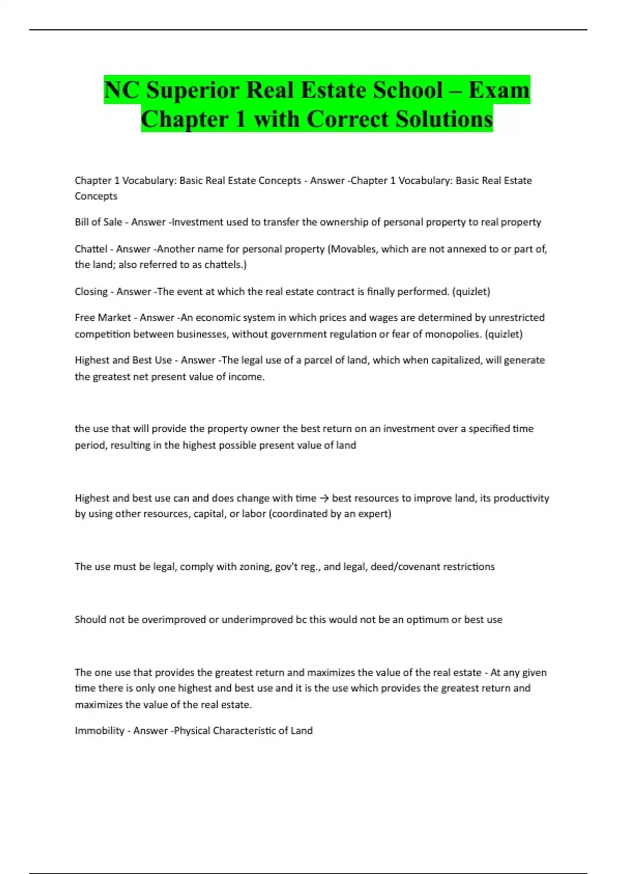 NC Superior Real Estate School – Exam Chapter 1 with Correct Solutions Chapter 1 Vocabulary: Basic Real Estate Concepts - Answer -Chapter 1 Vocabulary: Basic Real Estate Concepts Bill of Sale - Answer -Investment used to transfer the ownership of personal property to real property Chattel - Answer -Another name for personal property (Movables, which are not annexed to or part of, the land; also referred to as chattels.) Closing - Answer -The event at which the real estate contract is finally performed. (quizlet) Free Market - Answer -An economic system in which prices and wages are determined by unrestricted competition between businesses, without government regulation or fear of monopolies. (quizlet) Highest and Best Use - Answer -The legal use of a parcel of land, which when capitalized, will generate the greatest net present value of income. the use that will provide the property owner the best return on an investment over a specified time period, resulting in the highest possible present value of land Highest and best use can and does change with time → best resources to improve land, its productivity by using other resources, capital, or labor (coordinated by an expert) The use must be legal, comply with zoning, gov't reg., and legal, deed/covenant restrictions Should not be overimproved or underimproved bc this would not be an optimum or best use The one use that provides the greatest return and maximizes the value of the real estate - At any given time there is only one highest and best use and it is the use which provides the greatest return and maximizes the value of the real estate. Immobility - Answer -Physical Characteristic of Land