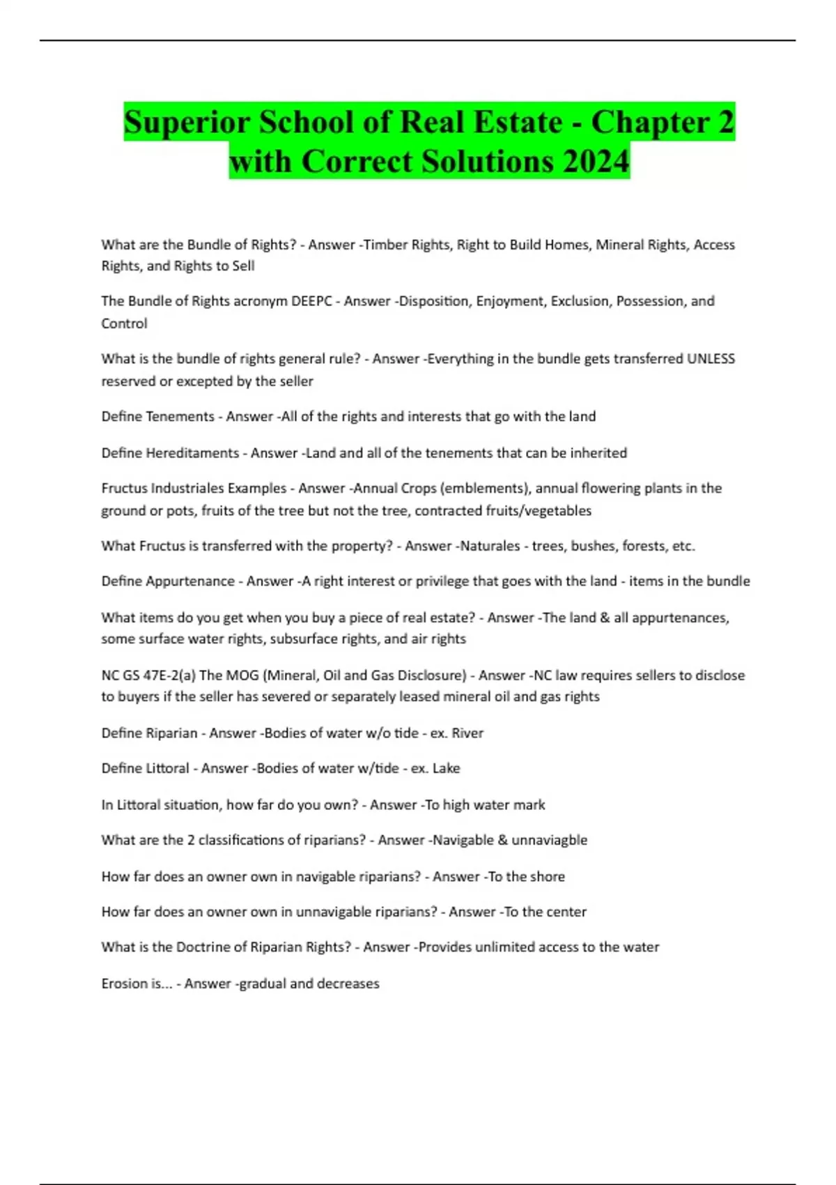 Superior School of Real Estate - Chapter 2 with Correct Solutions 2024