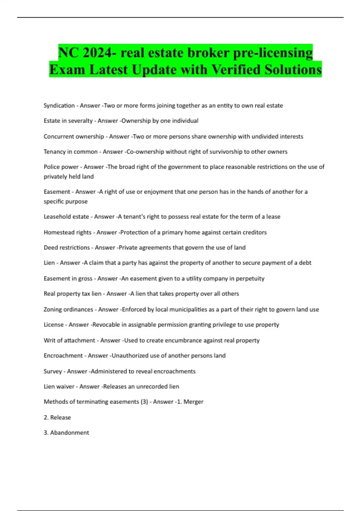 NC 2024- real estate broker pre-licensing Exam Latest Update with Verified Solutions Syndication - Answer -Two or more forms joining together as an entity to own real estate Estate in severalty - Answer -Ownership by one individual Concurrent ownership - Answer -Two or more persons share ownership with undivided interests Tenancy in common - Answer -Co-ownership without right of survivorship to other owners Police power - Answer -The broad right of the government to place reasonable restrictions on the use of privately held land Easement - Answer -A right of use or enjoyment that one person has in the hands of another for a specific purpose Leasehold estate - Answer -A tenant's right to possess real estate for the term of a lease Homestead rights - Answer -Protection of a primary home against certain creditors Deed restrictions - Answer -Private agreements that govern the use of land Lien - Answer -A claim that a party has against the property of another to secure payment of a debt Easement in gross - Answer -An easement given to a utility company in perpetuity Real property tax lien - Answer -A lien that takes property over all others Zoning ordinances - Answer -Enforced by local municipalities as a part of their right to govern land use License - Answer -Revocable in assignable permission granting privilege to use property Writ of attachment - Answer -Used to create encumbrance against real property Encroachment - Answer -Unauthorized use of another persons land Survey - Answer -Administered to reveal encroachments Lien waiver - Answer -Releases an unrecorded lien Methods of terminating easements (3) - Answer -1. Merger 2. Release 3. AbandonmentExpress agreement (easement) - Answer -Easement is real property interest and therefore transferred by deed and typically recordsd Types of specific liens (3) - Answer -1. Government lien 2. Mechanic/construction lien 3. Mortgage Types of general liens (3) - Answer -1. Judgment lien 2. IRS or state lien 3. Personal property tax lien Joint tenancy - Answer -Co-ownership with right of surv