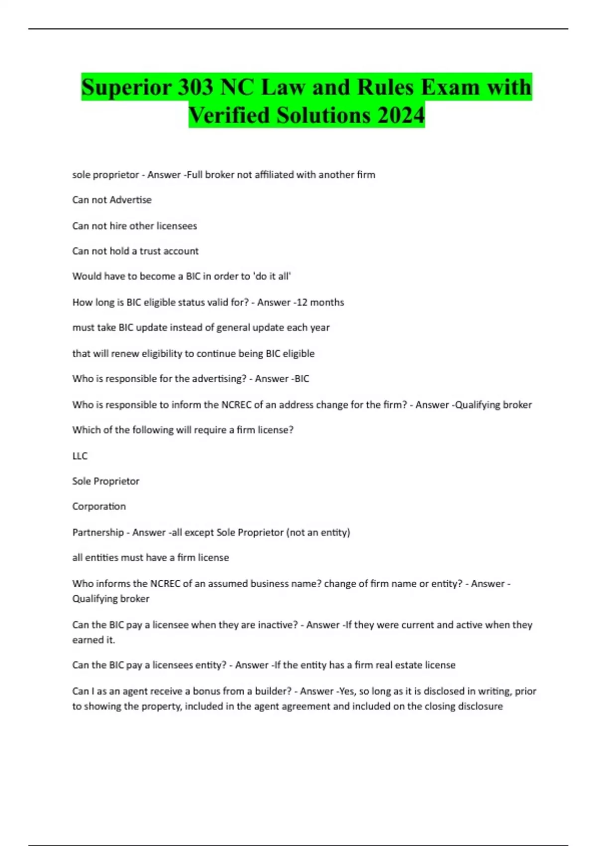 Superior 303 NC Law and Rules Exam with Verified Solutions 2024 sole proprietor - Answer -Full broker not affiliated with another firm Can not Advertise Can not hire other licensees Can not hold a trust account Would have to become a BIC in order to 'do it all' How long is BIC eligible status valid for? - Answer -12 months must take BIC update instead of general update each year that will renew eligibility to continue being BIC eligible Who is responsible for the advertising? - Answer -BIC Who is responsible to inform the NCREC of an address change for the firm? - Answer -Qualifying broker Which of the following will require a firm license? LLC Sole Proprietor Corporation Partnership - Answer -all except Sole Proprietor (not an entity) all entities must have a firm license Who informs the NCREC of an assumed business name? change of firm name or entity? - Answer - Qualifying broker Can the BIC pay a licensee when they are inactive? - Answer -If they were current and active when they earned it. Can the BIC pay a licensees entity? - Answer -If the entity has a firm real estate l