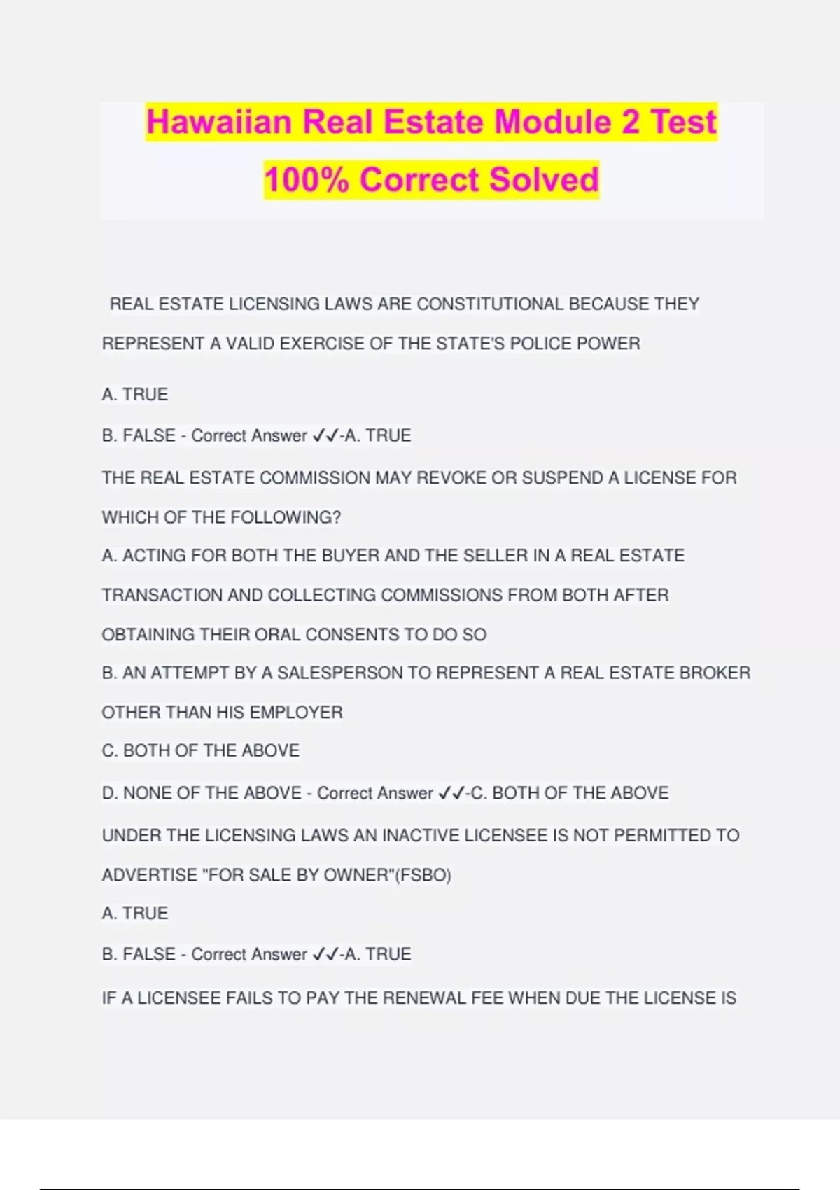Hawaiian Real Estate Module 2 Test 100% Correct Solved
