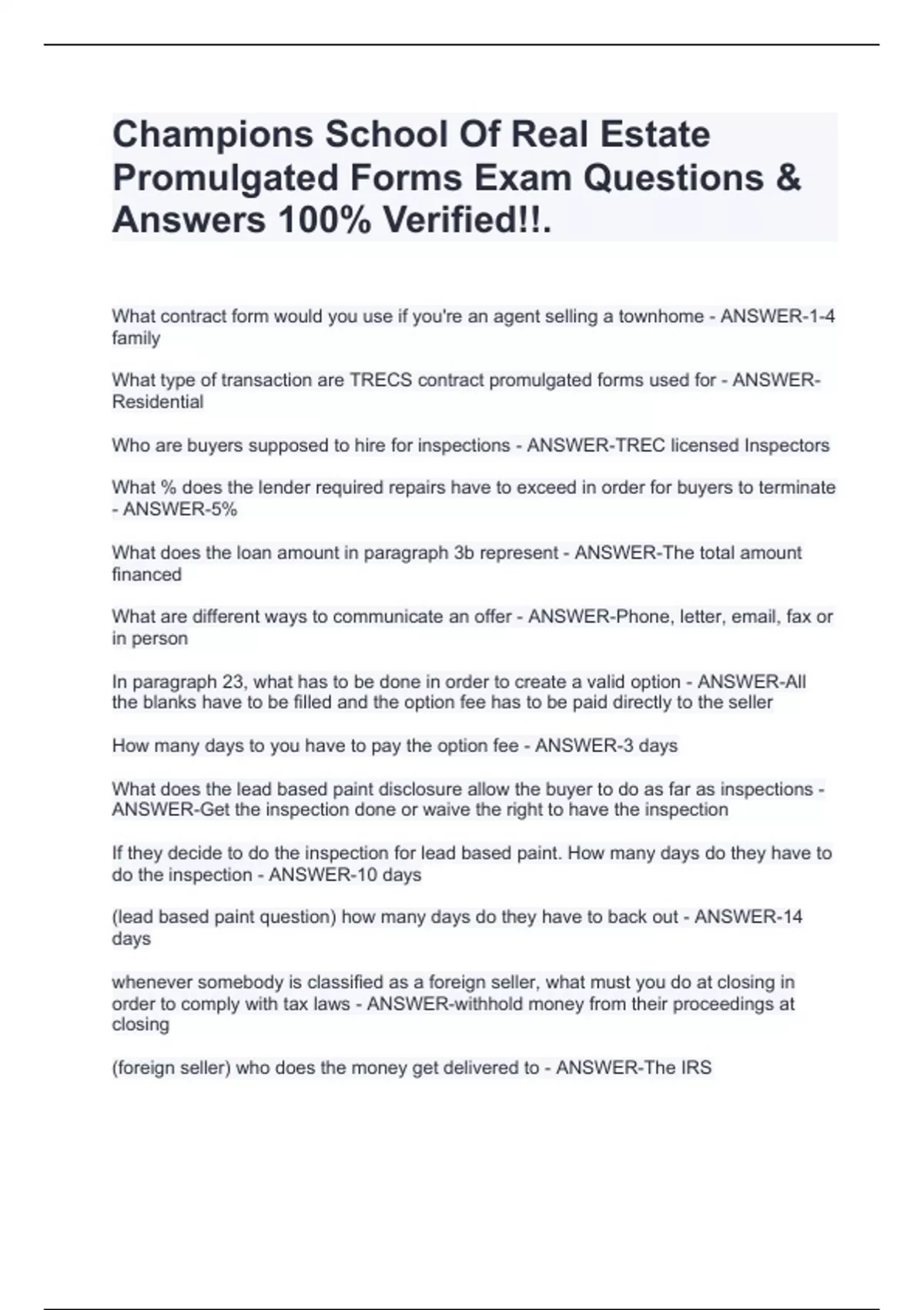 Champions School Of Real Estate Promulgated Forms Exam Questions & Answers 100% Verified!!. What contract form would you use if you're an agent selling a townhome - ANSWER-1-4 family What type of transaction are TRECS contract promulgated forms used for - ANSWER-Residential Who are buyers supposed to hire for inspections - ANSWER-TREC licensed Inspectors What % does the lender required repairs have to exceed in order for buyers to terminate - ANSWER-5% What does the loan amount in paragraph 3b represent - ANSWER-The total amount financed What are different ways to communicate an offer - ANSWER-Phone, letter, email, fax or in person In paragraph 23, what has to be done in order to create a valid option - ANSWER-All the blanks have to be filled and the option fee has to be paid directly to the seller How many days to you have to pay the option fee - ANSWER-3 days What does the lead based paint disclosure allow the buyer to do as far as inspections - ANSWER-Get the inspection done or waive the right to have the inspection If they decide to do the inspection for lead based paint. How many days do they have to do the inspection - ANSWER-10 days (lead based paint question) how many days do they have to back out - ANSWER-14 days whenever somebody is classified as a foreign seller, what must you do at closing in