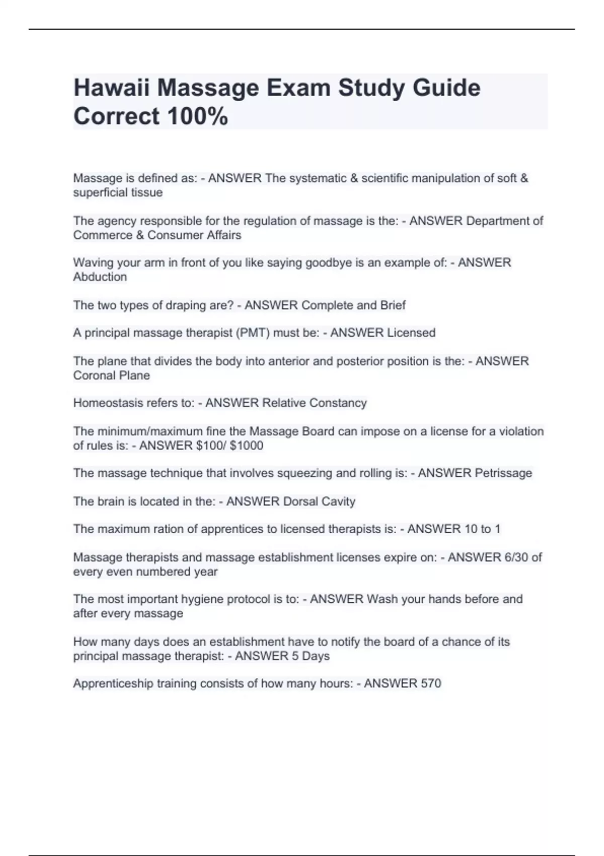 Massage is defined as: - ANSWER The systematic & scientific manipulation of soft & superficial tissue The agency responsible for the regulation of massage is the: - ANSWER Department of Commerce & Consumer Affairs Waving your arm in front of you like saying goodbye is an example of: - ANSWER Abduction The two types of draping are? - ANSWER Complete and Brief A principal massage therapist (PMT) must be: - ANSWER Licensed The plane that divides the body into anterior and posterior position is the: - ANSWER Coronal Plane Homeostasis refers to: - ANSWER Relative Constancy The minimum/maximum fine the Massage Board can impose on a license for a violation of rules is: - ANSWER $100/ $1000 The massage technique that involves squeezing