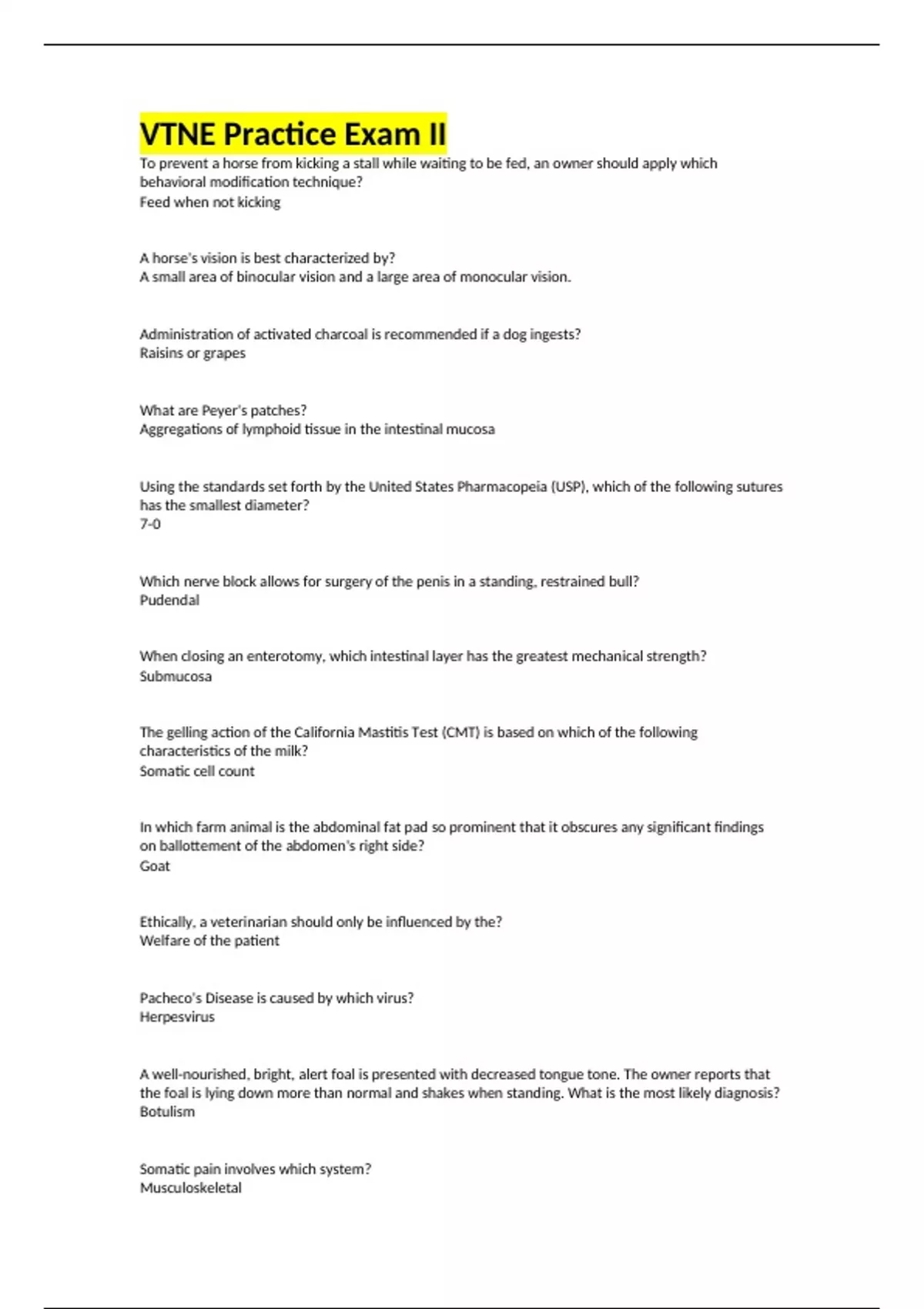 VTNE Practice Exam II To prevent a horse from kicking a stall while waiting to be fed, an owner should apply which behavioral modification technique? Feed when not kicking A horse's vision is best characterized by? A small area of binocular vision and a large area of monocular vision. Administration of activated charcoal is recommended if a dog ingests? Raisins or grapes What are Peyer's patches? Aggregations of lymphoid tissue in the intestinal mucosa Using the standards set forth by the United States Pharmacopeia (USP), which of the following sutures has the smallest diameter? 7-0 Which nerve block allows for surgery of the penis in a standing, restrained bull? Pudendal When closing an enterotomy, which intestinal layer has the greatest mechanical strength? Submucosa The gelling action of the California Mastitis Test (CMT) is based on which of the following characteristics of the milk? Somatic cell count In which farm animal is the abdominal fat pad so prominent that it obscures any significant findings on ballottement of the abdomen's right side? Goat Ethically, a veterinarian should only be influenced by the? Welfare of the patient Pacheco's Disease is caused by which virus? Herpesvirus A well-nourished, bright, alert foal is presented with decreased tongue tone. The owner reports that the foal is lying down more than normal and shakes when standing. What is the most likely diagnosis? Botulism Somatic pain involves which system? Musculoskeletal A cat hisses at a visitor and then the visitor leaves. This is an example of? Negative reinforcement In a normal animal, the best place to auscultate the aortic valve is the? Left fourth intercostal space dorsal to the mitral valve A female dog presents for a shifting leg lameness. Radiography is consistent with hypertrophic osteopathy. What is the most likely cause of the radiographic findings? Intrathoracic tumor Which of the following substances is released at the neuromuscular junction by somatic motor neurons? Acetylcholine The process of graft rejection is mediated primarily by? T cells Which chamber of the ruminant stomach is most similar to the simple stomach of most other species? Abomasum Which intracellular organelles are responsible for digesting phagocytized bacteria? Lysosomes Which parasite is considered to be the most pathogenic in the adult horse due to the damage it causes by its extensive larval migrations through the mesenteric arterial system? Strongylus vulgaris Patent ductus arteriosus (PDA) occurs between which two structures? Aorta and pulmonary artery Which intracellular messengers are increased by membrane-acting exotoxins, causing interference with intracellular signaling and regulation of cellular processes? cAMP and cGMP What type of perianal tumor occurs with the highest frequency in older intact male dogs? Adenoma What is the approximate age of a cow if the permanent lower canine teeth are erupting? 3.5 to 4 years At parturition, which hormone is responsible for contraction of the uterus and milk let down? Oxytocin