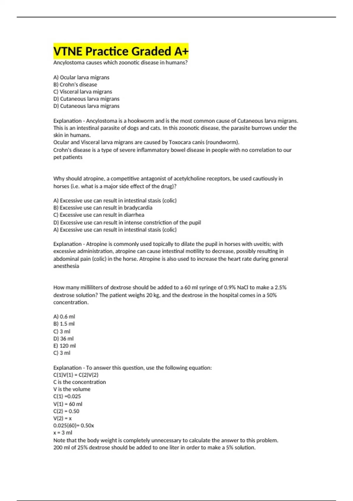 VTNE Practice Graded A+ Ancylostoma causes which zoonotic disease in humans? A) Ocular larva migrans B) Crohn's disease C) Visceral larva migrans D) Cutaneous larva migrans D) Cutaneous larva migrans Explanation - Ancylostoma is a hookworm and is the most common cause of Cutaneous larva migrans. This is an intestinal parasite of dogs and cats. In this zoonotic disease, the parasite burrows under the skin in humans. Ocular and Visceral larva migrans are caused by Toxocara canis (roundworm). Crohn's disease is a type of severe inflammatory bowel disease in people with no correlation to our pet patients Why should atropine, a competitive antagonist of acetylcholine receptors, be used cautiously in horses (i.e. what is a major side effect of the drug)? A) Excessive use can result in intestinal stasis (colic) B) Excessive use can result in bradycardia C) Excessive use can result in diarrhea D) Excessive use can result in intense constriction of the pupil A) Excessive use can result in intestinal stasis (colic) Explanation - Atropine is commonly used topically to dilate the pupil in horses with uveitis; with excessive administration, atropine can cause intestinal motility to decrease, possibly resulting in abdominal pain (colic) in the horse. Atropine is also used to increase the heart rate during general anesthesia How many milliliters of dextrose should be added to a 60 ml syringe of 0.9% NaCl to make a 2.5% dextrose solution? The patient weighs 20 kg, and the dextrose in the hospital comes in a 50% concentration. A) 0.6 ml B) 1.5 ml C) 3 ml D) 36 ml E) 120 ml C) 3 ml Explanation - To answer this question, use the following equation: C(1)V(1) = C(2)V(2) C is the concentration V is the volume C(1) =0.025 V(1) = 60 ml C(2) = 0.50 V(2) = x 0.025(60)= 0.50x x = 3 ml Note that the body weight is completely unnecessary to calculate the answer to this problem. 200 ml of 25% dextrose should be added to one liter in order to make a 5% solution. In dogs, which of the following are all permanent teeth with 2 roots? A) Maxillary premolars 2, 3, and 4, and molar 1 B) Mandibular premolars 2, 3, and 4, and molar 1 C) Maxillary molars 1 and 2 D) Mandibular premolar 1 and molars B) Mandibular premolars 2, 3, and 4, and molar 1 2 and 3 Explanation - While exceptions do occur, the following are generally accepted and true. In dogs, all of the permanent incisors and canine teeth have 1 root. In the mandible, premolar (PM) 1 has one root. PM 2, 3, and 4 all have two roots. M 1 and 2 have two roots. M3 can have one or two roots. In the maxilla, PM 1 has one root. PM 2 and 3 have two roots, although PM 3 can sometimes have 3 roots. PM 4 and M1 and 2 all have 3 roots. Which disease occurs when the body is unable to make or utilize insulin? A) Cushing's disease B) Diabetes C) Addison's disease D) Pancreatitis E) Hyperandrogenism B) Diabetes Explanation - Diabetes mellitus occurs when the pancreas does not make insulin or when there is insulin resistance such that the body is unable to utilize insulin. Which cranial nerve is known for three major branches? A) CN I B) CN V C) CN XI D) CN XII B) CN V Explanation - Cranial nerve V (five) is the Trigeminal nerve and has three major branches: First branch: Ophthalmic nerve- sensory to the eye socket and its contents, the anterior nasal cavity, and the skin of the nose and forehead. Second branch: Maxillary nerve- sensory to maxilla, nasal cavity/sinuses, palate, and part of the face. Third branch: Mandibular nerve (the largest branch)- sensory fibers to the lower jaw, the floor of the mouth, the anterior two-thirds of the tongue, the lower teeth, and supplies motor fibers to the muscles of mastication (note: that this is the only branch that supplies motor function). A patient who has stopped breathing after administration of a short-acting anesthetic can be described as being which of the following? A) Eupneic B) Atelectic C) Dyspneic D) Apneic D) Apneic Explanation - This patient would be apneic, which means the patient is not breathing. Dyspnea implies difficulty breathing. Eupnea is normal respiration. Atelectasis is the description given to collapsed lungs Which condition occurs least commonly in the horse? A) Laminitis B) Intestinal incarceration C) Enterolithiasis D) Urolithiasis D) Urolithiasis Explanation - As compared to small animals, urolithiasis is uncommon in horses. If they do develop stones in their bladder, it is usually secondary to formation of calcium oxalate crystals. Enterolithiasis and intestinal incarcerations are common reasons for colic in horses and usually require surgical intervention. Laminitis is a very serious and often life-threatening condition in horses. The pathophysiology of laminitis is poorly understood but involves inflammation of the lamina of the feet. It can involve all feet or even just one foot. There are multiple conditions that can lead to laminitis, such as endotoxemia, grain overload, and pneumonia. What is another method, besides drawing from the tail vein, to blood draw in a laboratory rat? A) Cephalic vein B) Periorbital plexus C) Jugular vein D) Anterior vena cava B) Periorbital plexus Explanation - The periorbital plexus can be used in sedated rats to collect small blood samples using a hematocrit tube. The other methods are not used in laboratory rats A 12-pound cat has presented with diabetic ketoacidosis and is currently in shock. The doctor orders that a 40 ml/kg bolus of 0.9% saline be administered. How many milliliters will this patient receive? A) 220 ml B) 9 ml C) 480 ml D) 36 ml A) 220 ml Explanation - The body weight needs to be converted to kilograms. 12 lb / (2.2 lb/kg) = 5.5 kg 5.5 kg x (40 ml/kg) = 220 ml Which of the following is a term for a method of urine collection from a patient in a sterile manner? A) Cystotomy B) Cystocentesis C) Cystogram D) Free catch B) Cystocentesis Explanation - Cystocentesis involves the sterile introduction of a needle into the bladder for collection of urine. A free catch 