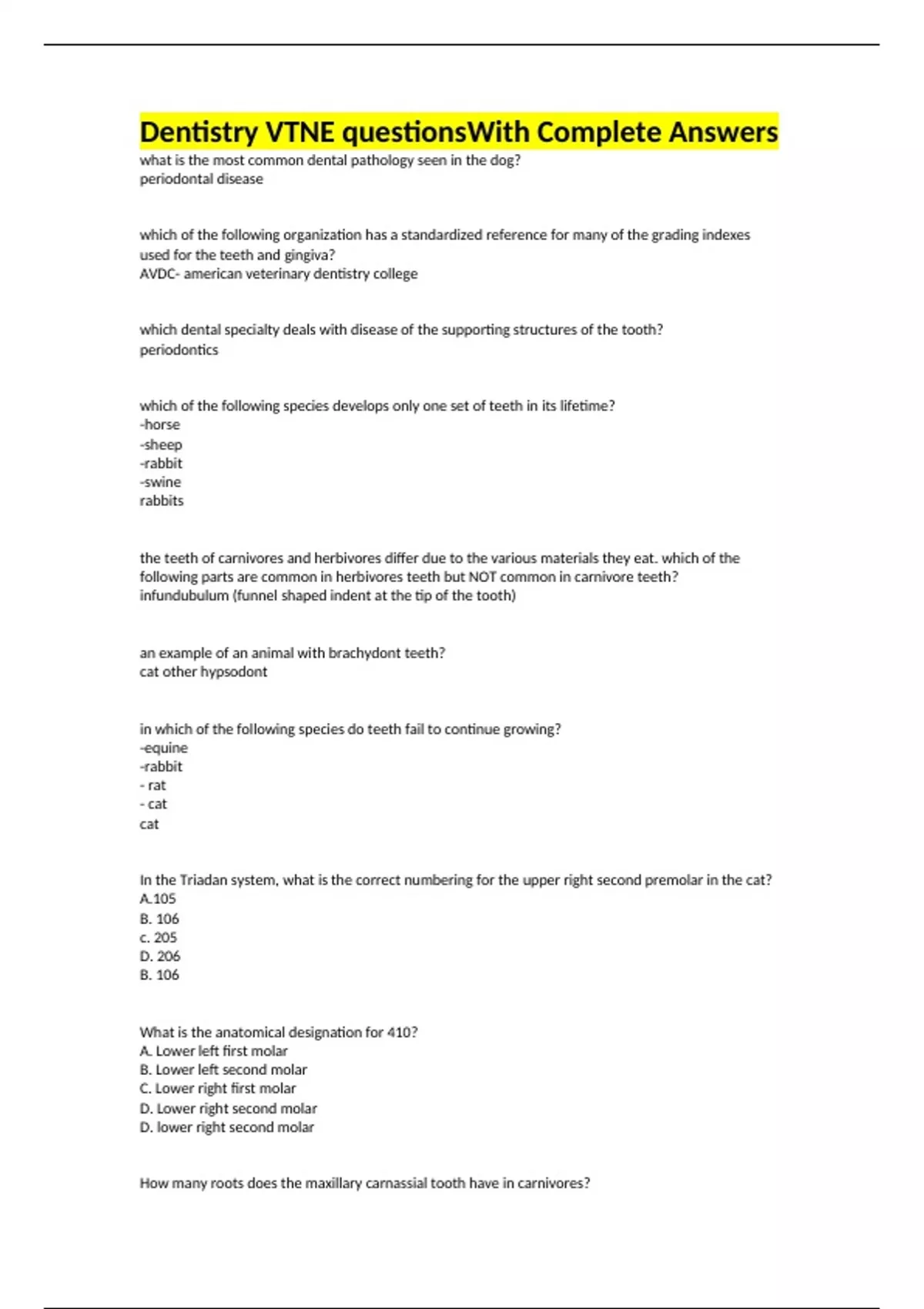Dentistry VTNE questionsWith Complete Answers what is the most common dental pathology seen in the dog? periodontal disease which of the following organization has a standardized reference for many of the grading indexes used for the teeth and gingiva? AVDC- american veterinary dentistry college which dental specialty deals with disease of the supporting structures of the tooth? periodontics which of the following species develops only one set of teeth in its lifetime? -horse -sheep -rabbit -swine rabbits the teeth of carnivores and herbivores differ due to the various materials they eat. which of the following parts are common in herbivores teeth but NOT common in carnivore teeth? infundubulum (funnel shaped indent at the tip of the tooth) an example of an animal with brachydont teeth? cat other hypsodont in which of the following species do teeth fail to continue growing? -equine -rabbit - rat - cat cat In the Triadan system, what is the correct numbering for the upper right second premolar in the cat?A.105 B. 106 c. 205 D. 206 B. 106 What is the anatomical designation for 410? A. Lower left first molar B. Lower left second molar C. Lower right first molar D. Lower right second molar D. lower right second molar How many roots does the maxillary carnassial tooth have in carnivores? A. One B. Two C. Three D. Four C. three The cat has which of the following numbers of maxillary and mandibular premolars in one half of the mouth? A. 3 and 2 B. 3 and 3 C. 2 and 3 D. 2 and 2 A. 3 and 2 The dental formula for the permanent teeth in the dog is 2 (I 3/3 and C 1/1) plus...? A. P ¾ and M 3/2 = 40 B. P ¾ and M 3/3 = 40 C. P 4/4 and M 2/3 = 42 D. P 4/4 and M 3/2 = 42 P 4/4 and M 2/3 = 42 What is the main purpose of premolar teeth? A. Holding and tearing B. Cutting and breaking C. Grinding D. Gnawing and grooming B. Cutting and breaking (shearing) Which teeth on each side of the mouth in the dog have three roots? A. Maxillary third and fourth premolar and first molar B. Maxillary fourth premolars and first and second molar C. Mandibular fourth premolars and first and second molar D. Mandibular and maxillary fourth premolars and first and second molar B. Maxillary fourth premolars and first and second molar The permanent canine and premolar teeth in dogs generally erupts at about what age? A. 3 to 5 months B. 4 to 6 months C. 5 to 7 months D. 6 to 8 months B. 4 to 6 months Using the Triadan system, the proper way of describing the dog's first upper left permanent premolar is: A. 205 B. 105 C. 306 D. 502 A. 205 Using the Triadan system, the proper way of describing the cat's first lower right molar is: A. 407 B. 409 C. 109 D. 909 B.409 The carnassial teeth in dogs are: A. 4P4, 1M1 B. 4P4 and 4P4 C. 1M1 and 1M1 D. 1C1 and 1C1 A. 4P4, 1M1 The fourth premolar in the upper left quadrant is: A. 108 B. 204 C. 208 D. 308 C. 208 The upper fourth premolar and first molar teeth are termed: A. Carnassial teeth B. Dilacerated C. Diphyodont D. Deciduous A. carnassial teeth With the Triadan numbering system, what number is assigned to the left lower fourth premolar A. 108, B. 208, C. 308, D. 408 C. 308 True or false: The mandible of a dog contains no three rooted teeth True The canine has ___ teeth with 3 roots: A) 2 B) 4 C) 6 D) 8 C) 6 True or false: When charting a dental formula, a lower-case "I" indicates a permanent incisor. False In dogs, which are called the carnassial teeth? A) First molar in the lower arcade and fourth premolar in the upper arcade B) Second molar in the lower arcade and third premolar in the upper arcade C) Third molar in the lower arcade and first premolar in the upper arcade D) Fourth molar in the lower arcade and second premolar in the upper arcade A) First molar in the lower arcade and fourth premolar in the upper arcade A correct statement regarding the identifying traits of canine teeth is that they: A) Are known as cheek teeth B) Have flat, occlusal surfaces C) May appear as tusks in some species D) Have multiple sharp points in carnivores C) May appear as tusks in some species The Triadan system is: A) A tooth identification system designed to aid in dental charting B) A complete system that includes an ultrasonic scaler and polisher C) A method for performing radiographs of molars D) A complete home care dental system for use by clients A) A tooth identification system designed to aid in dental charting Which of the following teeth are not normally present in the adult cat? A) Upper PM1 and lower PM1, and PM2 B) Lower PM1 and upper PM1 and PM2 C) Upper M2 and lower molar M1 D) Lower M2 and upper molar M2 A) Upper PM1 and lower PM1, and PM2 The most common oral malignant tumor in cats is: A. melanoma B. Osteosarcoma C. Fibrosarcoma D. Squamous cell carcinoma D. Squamous cell carcinoma A new theory regarding the cause of resorptive lesions in cats is: A. hypervitaminosis D Hyperparathyroidism A low pH diet Calicivirus A. hypervitaminosis D Rostral cross bite is classified under the following class of malocclusion: A. Class I B. Class II C. Class III D. Wry bite A. Class I