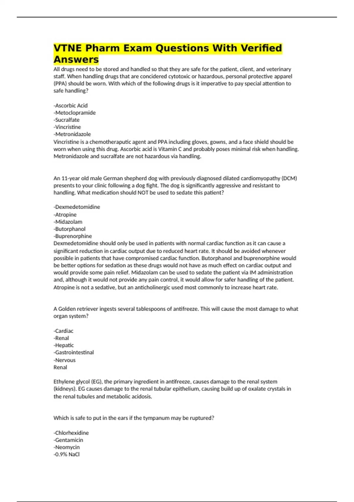 VTNE Pharm Exam Questions With Verified Answers All drugs need to be stored and handled so that they are safe for the patient, client, and veterinary staff. When handling drugs that are concidered cytotoxic or hazardous, personal protective apparel (PPA) should be worn. With which of the following drugs is it imperative to pay special attention to safe handling? -Ascorbic Acid -Metoclopramide -Sucralfate -Vincristine -Metronidazole Vincristine is a chemotheraputic agent and PPA including gloves, gowns, and a face shield should be worn when using this drug. Ascorbic acid is Vitamin C and probably poses minimal risk when handling. Metronidazole and sucralfate are not hazardous via handling. An 11-year old male German shepherd dog with previously diagnosed dilated cardiomyopathy (DCM) presents to your clinic following a dog fight. The dog is significantly aggressive and resistant to handling. What medication should NOT be used to sedate this patient? -Dexmedetomidine -Atropine -Midazolam -Butorphanol -Buprenorphine Dexmedetomidine should only be used in patients with normal cardiac function as it can cause a significant reduction in cardiac output due to reduced heart rate. It should be avoided whenever possible in patients that have compromised cardiac function. Butorphanol and buprenorphine would be better options for sedation as these drugs would not have as much effect on cardiac output and would provide some pain relief. Midazolam can be used to sedate the patient via IM administration and, although it would not provide any pain control, it would allow for safer handling of the patient. Atropine is not a sedative, but an anticholinergic used most commonly to increase heart rate. A Golden retriever ingests several tablespoons of antifreeze. This will cause the most damage to what organ system? -Cardiac -Renal -Hepatic -Gastrointestinal -Nervous Renal Ethylene glycol (EG), the primary ingredient in antifreeze, causes damage to the renal system (kidneys). EG causes damage to the renal tubular epithelium, causing build up of oxalate crystals in the renal tubules and metabolic acidosis. Which is safe to put in the ears if the tympanum may be ruptured? -Chlorhexidine -Gentamicin -Neomycin -0.9% NaCl Saline (0.9% sodium chloride) is considered safe. The others listed (especially aminoglycoside antibiotics) could potentially be ototoxic if the eardrum is not intact. Which of the following medications is commonly found over-the-counter (OTC)? -Diphenhydramine -Pimobendan -Hydrocodone -Doxycycline Diphenhydramine The other name for diphenhydramine is Benadryl and can be found over-the-counter. Hydrocodone is commonly used as a cough suppressant in veterinary medicine and is a controlled substance requiring a prescription. Doxycycline (an antibiotic) and Pimobendan (a heart medication) are by prescription only. How many milliliters of 50% dextrose should be added to a 100 ml solution of Lactated Ringer's Solution to make it 2.5%? 0.5 ml 5 ml 10 ml 1 ml 50 ml To answer this question, the following formula should be implemented: C(1)V(1) = C(2)V(2) C is the concentration V is the volume C(1) =0.5 V(1) = x C(2) = 0.025 V(2) = 100 ml 0.5x = 0.025(100) x = 5 ml 5 ml of 50% dextrose should be added to 100 ml in order to make a 2.5% solution. How many milliliters should be administered to a 100-kg patient that needs 50 mg of a 2.5% solution? 25 ml 125 ml 2 ml 2.5 ml Percent is equal to weight (in Grams) / 100 parts volume (in mLs) (This is based on water since 1 mL weighs 1 Gram): Example: A 3% solution: 3 Grams / 100 mL or 3000 mg / 100 mL or 30 mg/mL The easiest way to remember is to just add a zero onto any percentage for the milligrams (i.e. 2% solution = 20 mg/ml; 10% solution = 100 mg/ml, etc.) In this situation a 2.5% solution is equivalent to 25 mg/ml. Therefore: 50 mg / (25 mg/ml) = 2 ml A drug that is a cholinergic agent will have which of the following effects? -Dilate the pupil -Slow the heart rate -Cause central nervous system depression -Decrease salivation -Decrease intestinal motility Slow the heart rate Cholinergic agents are drugs that mimic the effects of acetylcholine within the autonomic nervous system. These drugs stimulate the parasympathetic nervous system. They promote salivation, lacrimation, urination, and defecation (sometimes abbreviated SLUD or referred to as "rest and digest" functions). They can cause pupil constriction or decreased heart rate. A commonly used cholinergic drug is bethanechol which is structurally similar to acetylcholine but resists degradation. It is used to treat gastric atony or urinary retention in the bladder. A patient is hospitalized with a resistant infection and is getting Amikacin injections and IV fluid therapy. Amikacin can cause kidney damage. What could you do to monitor for early renal side effects? -Check a daily urine protein -Monitor urine output -Renal ultrasound daily -Check the urine specific gravity twice daily Check a daily urine protein. Proteinuria can be one of the first things seen if there is damage to the kidneys. Urine output and specific gravity would not be reliable indicators since this patient is on IV fluids. Ultrasound would not be helpful picking up early kidney damage since this occurs at a microscopic level in the renal tubules. Kidney changes can be seen with ultrasound only if gross disease is present in the renal architecture. BUN and creatinine levels can be helpful, however, remember that usually these values do not become elevated until more than 70% of the renal function has been compromised. What quantity of drug is found in 200 mLs of a 10% solution? 20 milligrams 20 grams 2,000 milligrams 2,000 grams 20 grams. A 10% solution is equal to 100 mg/mL. The easiest way to remember this conversion is to add a zero to the percentage. (10%= 100 mg/mL, 15% = 150 mg/mL, etc.) If 1 mL is equal to 100 mg, then to find out the quantity of drug in 200 mLs, multiply 100 mg X 200 = 20,000 mg. There are 20,000 mg in 200 mLs 