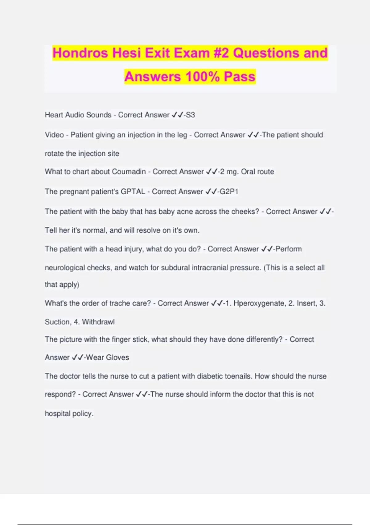 Hondros Hesi Exit Exam #2 Questions and Answers 100% Pass Heart Audio Sounds - Correct Answer ️️ -S3 Video - Patient giving an injection in the leg - Correct Answer ️️ -The patient should rotate the injection site What to chart about Coumadin - Correct Answer ️️ -2 mg. Oral route The pregnant patient's GPTAL - Correct Answer ️️ -G2P1 The patient with the baby that has baby acne across the cheeks? - Correct Answer ️️ - Tell her it's normal, and will resolve on it's own. The patient with a head injury, what do you do? - Correct Answer ️️ -Perform neurological checks, and watch for subdural intracranial pressure. (This is a select all that apply) What's the order of trache care? - Correct Answer ️️ -1. Hperoxygenate, 2. Insert, 3. Suction, 4. Withdrawl The picture with the finger stick, what should they have done differently? - Correct Answer ️️ -Wear Gloves The doctor tells the nurse to cut a patient with diabetic toenails. How should the nurse respond? - Correct Answer ️️ -The nurse should inform the doctor that this is not hospital policy. A wheelchair patient with left hemiplegia, how would you place their wheelchair when they are in bed? - Correct Answer ️️ -Place the wheelchair at the right side of the bed. When should you start screening kids for childhood obesity? - Correct Answer ️️ - Kindergarten With patient's with hyperthyroidism, what type of diet should you expect them to be ordered to have? - Correct Answer ️️ -Continue with a high calorie diet. When a patient experiences symptoms of alcohol withdrawal, what medication can the PN expect to be ordered? - Correct Answer ️️ -Ativan (Lorazepam) What mobility interventions would the PN expect to see for a patient with a recent hip surgery? - Correct Answer ️️ -Abduction positioning The pregnant patient is only comfortable laying flat on her back. What interventions should the PN perform to prevent complications? - Correct Answer ️️ -Place a pillow under her right hip. The pregnant patient is taking prenatal vitamins, and reports changes in her stool. What can the PN advise her is likely the cause of these changes? - Correct Answer ️️ -This is common, especially with taking a vitamin loaded with Iron (FE Sulfate). The patient with liver cirrhosis needs an assessment, what findings would you be looking for in this assessment? Select all that apply. - Correct Answer ️️ -Assess the legs, feet, and look for jaundice. (Assessing the legs shows any signs