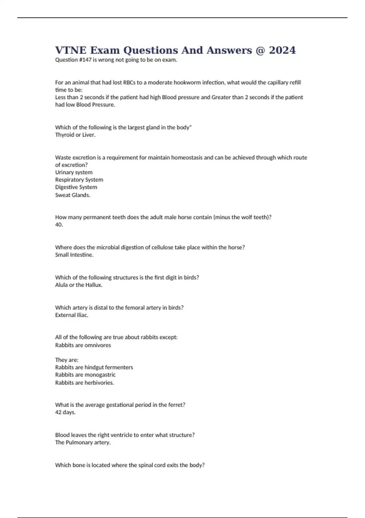 VTNE Exam Questions And Answers @ 2024 Question #147 is wrong not going to be on exam. For an animal that had lost RBCs to a moderate hookworm infection, what would the capillary refill time to be: Less than 2 seconds if the patient had high Blood pressure and Greater than 2 seconds if the patient had low Blood Pressure. Which of the following is the largest gland in the body" Thyroid or Liver. Waste excretion is a requirement for maintain homeostasis and can be achieved through which route of excretion? Urinary system Respiratory System Digestive System Sweat Glands. How many permanent teeth does the adult male horse contain (minus the wolf teeth)? 40. Where does the microbial digestion of cellulose take place within the horse? Small Intestine. Which of the following structures is the first digit in birds? Alula or the Hallux. Which artery is distal to the femoral artery in birds? External Iliac. All of the following are true about rabbits except: Rabbits are omnivores They are: Rabbits are hindgut fermenters Rabbits are monogastric Rabbits are herbivories. What is the average gestational period in the ferret? 42 days. Blood leaves the right ventricle to enter what structure? The Pulmonary artery. Which bone is located where the spinal cord exits the body? Occipital bone. The ribs that make up the caudal part of the thorax are called The floating ribs. Which of the following characteristics would be examples of a barrier to communication? Cultures. Which of the following is considered a disadvantage of computerized medical records: Computer generated records can lack medical details. Which of the following will not be found on an inventory log? Client name, patient name. If the cat in the previous question requires an additional 160 ml of water daily, how many additional 45-mL boluses of water must be given? 3.5 boluses. You have an injectable calcium solution is 3mg/ml . How much do you add to 1L of lactated ringers solution to deliver 4mg/hr of calcium at a fluid rate of 30 ml/hr? 4.4mls. The level of fluid in the 1L IV bag reads halfway between the 4 and 5 marks. How much fluid remains in the bag? 450mls. How many mg of Dextrose does 1ml of 50% dextrose solution contain? 500mg/ml. A pet needs 100mg of a tablet and the medication is available as a 50mg tablet. How many tablets will be needed? 2. Tablets. A pet needs butorphanol for pain at a dose of 0.04mg/kg and the medication is available in a 10 mg/ml solution. The pet weighs 4 pounds. How many ml will be administered? 0.01ml. A 50-lb dog needs IV fluids at two times maintenance (132ml/kg/24hr). How many fluids will the patient receive in a 24-hour period? 3000mls. The concentration of furosemide is 10%. How many mg are in 1.2ml? 120mg. A commercial cat food is 120 kcal/cup. A cat weighing 5 pounds fed a rate of 40 cal/lb/day should be fed how many cups at each meal if you feed him twice a day. 0.8 cup or 1 cup. A dose of 40meq Kcl has been added to 1L of normal saline. What drip rate would provide a patient with 1meq Kcl/hr? 25ml/hr. A 45-kg animal weights how many pounds 99lbs. how many mg of Dextrose does 6ml of 50% dextrose solution contain? 3000mg. 500mg/ml x 6ml = 3000mg (A 50% solution is 500mg/ml.) The demarcation line that separates the left and right ventricles of the heart is termed as an: The line of demarcation is the Intraventricular groove but it does not technically separate the right and the left ventricles. The intraventricular septum is what separates the right and left ventricles but it is not technically a line of demarcation. ______________ is a primitive red blood cell. Hematoblast. Total enteral nutrition is correctly defined as which of the following? Nutrition that is given intravenously as a peg tube is technically not administering nutrition through the mouth. Painful urination as a result of muscle spasms in the urinary bladder and urethra is referred to as: As written the painful urination could lead a person to think that dysuria is the correct response. Or, Straining to urinate is referred to as: Stranguria. When the amount of glycogen in the liver is depleted it is known as: Ketosis. A bacterial genus can best be described as: Composed of one or more species. A decrease in albumin may occur in cases experiencing: Chronic liver disease or Gastroenteritis. Zoonotic Parasites are: Toxoplasma