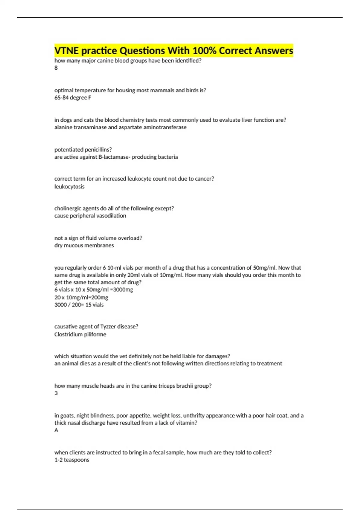 VTNE practice Questions With 100% Correct Answers how many major canine blood groups have been identified? 8 optimal temperature for housing most mammals and birds is? 65-84 degree F in dogs and cats the blood chemistry tests most commonly used to evaluate liver function are? alanine transaminase and aspartate aminotransferase potentiated penicillins? are active against B-lactamase- producing bacteria correct term for an increased leukocyte count not due to cancer? leukocytosis cholinergic agents do all of the following except? cause peripheral vasodilation not a sign of fluid volume overload? dry mucous membranes you regularly order 6 10-ml vials per month of a drug that has a concentration of 50mg/ml. Now that same drug is available in only 20ml vials of 10mg/ml. How many vials should you order this month to get the same total amount of drug? 6 vials x 10 x 50mg/ml =3000mg 20 x 10mg/ml=200mg 3000 / 200= 15 vials causative agent of Tyzzer disease? Clostridium piliforme which situation would the vet definitely not be held liable for damages? an animal dies as a result of the client's not following written directions relating to treatment how many muscle heads are in the canine triceps brachii group? 3 in goats, night blindness, poor appetite, weight loss, unthrifty appearance with a poor hair coat, and a thick nasal discharge have resulted from a lack of vitamin? A when clients are instructed to bring in a fecal sample, how much are they told to collect? 1-2 teaspoons a free-roaming dog is brought to your clinic for listlessness and dyspnea. When performing venipuncture, you notice that the animal seems to have a prolonged clotting time. You suspect that the patient may have ingested? anticoagulant rodent poison primary ovarian structure is responsible for the release of estrogen? follicle higher the hematocrit and total protein values, the greater the degree of? dehydration minimum relative humidity in a neonatal puppy housing unit should be? 50% cardiac arrhythmias that occur during anesthesia are commonly associated with all of the following except? normocapnia 2 tooth buds that grow together to form one larger tooth is referred to as? fusion anterior drawer movement detects a problem with the? stifle underlying disease for most cases of feline aortic thromboembolism is? myocardial disease local anesthetics? prevent nerve cell depolarization male guinea pig is called a? boar false about eruption of permanent teeth? permanent lower canines erupt buccal to the deciduous canines failure of an organ or a part of an organ to grow to its full size is an example of? hypoplasia steatorrhea refers to? fat in the stool to supply nearly adequate nutrition via the IV route, solutions used must be? hypertonic drug is the most potent sedative? detomidine to flash sterilize an instrument, the autoclave settings should be? 270 degree F, 30 lb pressure, 4 min, fast exhaust agent, method, or device is most appropriate for sterilizing a pair of dissecting scissors to be used in a surgical procedure? liquid chemical disinfectant on a CBC, all of the following findings could be expected in a patient with an infection, except? narrow buffy coat what species has multiple forms of reticulocytes? cat an expectorant is a drug that acts to? liquefy and dilute viscous secretions in the respiratory tract extent to which measurements agree with the true value of the quantity measured is? accuracy most common mistake made in treating periodontal disease is? inadequate root planning in pigs how long can a stress neutrophilia last? 8 hours what type of dressing best helps debride a wound with extensive tissue damage? wet saline dressing fresh frozen plasma can be stored up to___ and still contain clotting factors. 12 months a cat diagnosed with hyperthyroidism may be offered a number of treatment options, including all but which of the following? fenbendazole medical management sialoschesis suppression of the flow of saliva principal cation in extracellular fluid is? Na^+ cranial nerve provides parasympathetic innervation to the heart, lungs, stomach, and small intestine? vagus (X) dry matter analysis of nutrient after moisture has been removed unit of measure is most commonly used for serum potassium? mEq what medical record format takes more time to compile? problem-oriented medical records what measure would be of no use in monitoring patients given succinylcholine? jaw muscle tone in the equine, what term describes a drainage tract resulting from a crack in the white line? gravel a small filament produces an image of? greater detail than a large filament pin indexing on inhalant anesthetic machine is used to? prevent oxygen and nitrous oxide cylinders from being exchanged a rabbit with a purulent nasal discharge and conjunctivitis would most likely be affected by? snuffles structure not part of the large intestine? illeum why are intensifying screens added to an x-ray cassette? to cause light exposure of the film what effect do procaine and benzathine have on penicillin G? they prolong absorption of penicillin G from the injection site According to the Punnett square, in a cross of Bb x Bb, the F1 generations will be made up of? 25%, 50%, and 25%, or 1:2:1 PCV of the abdominal fluid of an animal with urologic injury is? lower than the peripheral PCV when autoclaving, the minimum temperature and exposure time for the center of the surgical packs is? 250 degree F for 15 minutes a new in-house test has been developed with 80% sensitivity and 100% specificity. What does this mean? 20% will be false negative the adrenal cortex is made up of all of the following except? zona medullata when using hand instruments to clean teeth? use a modified pen grasp with overlapping pull strokes that are directed away from the gingival margin Mus musculus is the scientific name of the? mouse neuromuscular blocking agents? do not cross the blood brain barrier term that refers to making an incision through the abdominal wall is? lapar