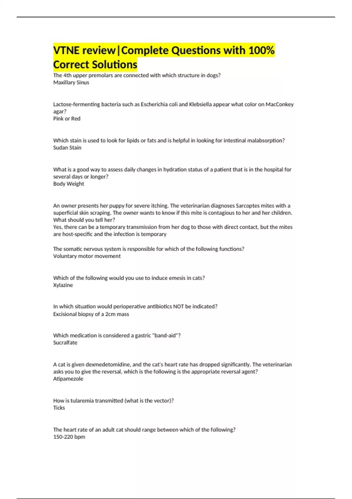 VTNE review|Complete Questions with 100% Correct Solutions The 4th upper premolars are connected with which structure in dogs? Maxillary Sinus Lactose-fermenting bacteria such as Escherichia coli and Klebsiella appear what color on MacConkey agar? Pink or Red Which stain is used to look for lipids or fats and is helpful in looking for intestinal malabsorption? Sudan Stain What is a good way to assess daily changes in hydration status of a patient that is in the hospital for several days or longer? Body Weight An owner presents her puppy for severe itching. The veterinarian diagnoses Sarcoptes mites with a superficial skin scraping. The owner wants to know if this mite is contagious to her and her children. What should you tell her? Yes, there can be a temporary transmission from her dog to those with direct contact, but the mites are host-specific and the infection is temporary The somatic nervous system is responsible for which of the following functions? Voluntary motor movement Which of the following would you use to induce emesis in cats? Xylazine In which situation would perioperative antibiotics NOT be indicated? Excisional biopsy of a 2cm mass Which medication is considered a gastric "band-aid"? Sucralfate A cat is given dexmedetomidine, and the cat's heart rate has dropped significantly. The veterinarian asks you to give the reversal, which is the following is the appropriate reversal agent? Atipamezole How is tularemia transmitted (what is the vector)? Ticks The heart rate of an adult cat should range between which of the following? 150-220 bpm What species, if overworked, is most at risk for hyperthermia? Sheep You are assisting with thoracocentesis and the fluid removed from the chest has a very foul odor. Which of the following types of pleural effusions is most likely? Pyothorax Which part of the brain is associated with regulation and coordination of movement, posture, and balance? Cerebellum What type of muscle is the heart? Striated muscle, involuntary What is the maximum amount of oral fluids that a horse should receive at a time? 6-8 Liters For which very contagious and rapidly fatal disease are ferrets vaccinated against? Canine distemper What represents depolarization from the SA node through the atria on an electrocardiogram (ECG)? P wave What is the common term for Psittacosis (Ornithosis)? Parrot Fever Which of the following represents the source of the most radiation exposure to a veterinary technician who is restraining a cat for a radiograph, taking the exposure, and processing the film? Scatter from the patient area Your neighbor just bought some pet mice and asks you about breeding them. He wants to know how long their estrus and gestation are. Which of the following is most accurate? Estrus 4-6 days, gestation 19-21 days Which of the following are treatments for hyperthyroidism? Methimazole and radioactive iodine A drug from which of the following categories will cause loss of motor function when administered during an epidural? Local Anesthetics Yersinia pestis is the causative agent for which zoonotic disease? Plague What would NOT be a potential indicator of intraoperative pain? Decreased blood pressure Potassium citrate is most often given to dogs for which of the following reasons? Prevent bladder stones A kitten presents to the emergency service for burns in the mouth after biting into an electrical cord. Aside from the oral burns, what organ system would you most be concerned about? Lungs A rupture or tear in the thoracic duct would result in which of the following? Chylothorax Which of the following drugs should not be given to any animal intended for human consumption? Chloramphenicol The correct order of the ruminant digestive system in regards to the chambers of their stomach is: Rumen, reticulum, omasum, abomasum. Which of the following description of the properties of an inhalant anesthetic is true? Drugs with low minimum alveolar concentrations (MAC) are the most potent An elevated PCV is considered normal for which of the following breeds? Greyhound Trichomoniasis causes which of the following conditions in cattle? Abortions The pancreas connects to which part of the intestine? Duodenum A diet high in concentrates or grains may lead to which of the following in cattle? Decreased rumen pH The fetlock joint of a horse refers to what structure? Metacarpophalangeal joint Calcinosis cutis, or calcium deposits in the skin, can be seen with long term use of which drug? Prednisone Which neurotransmitter is associated with the sympathetic nervous system? Epinephrine