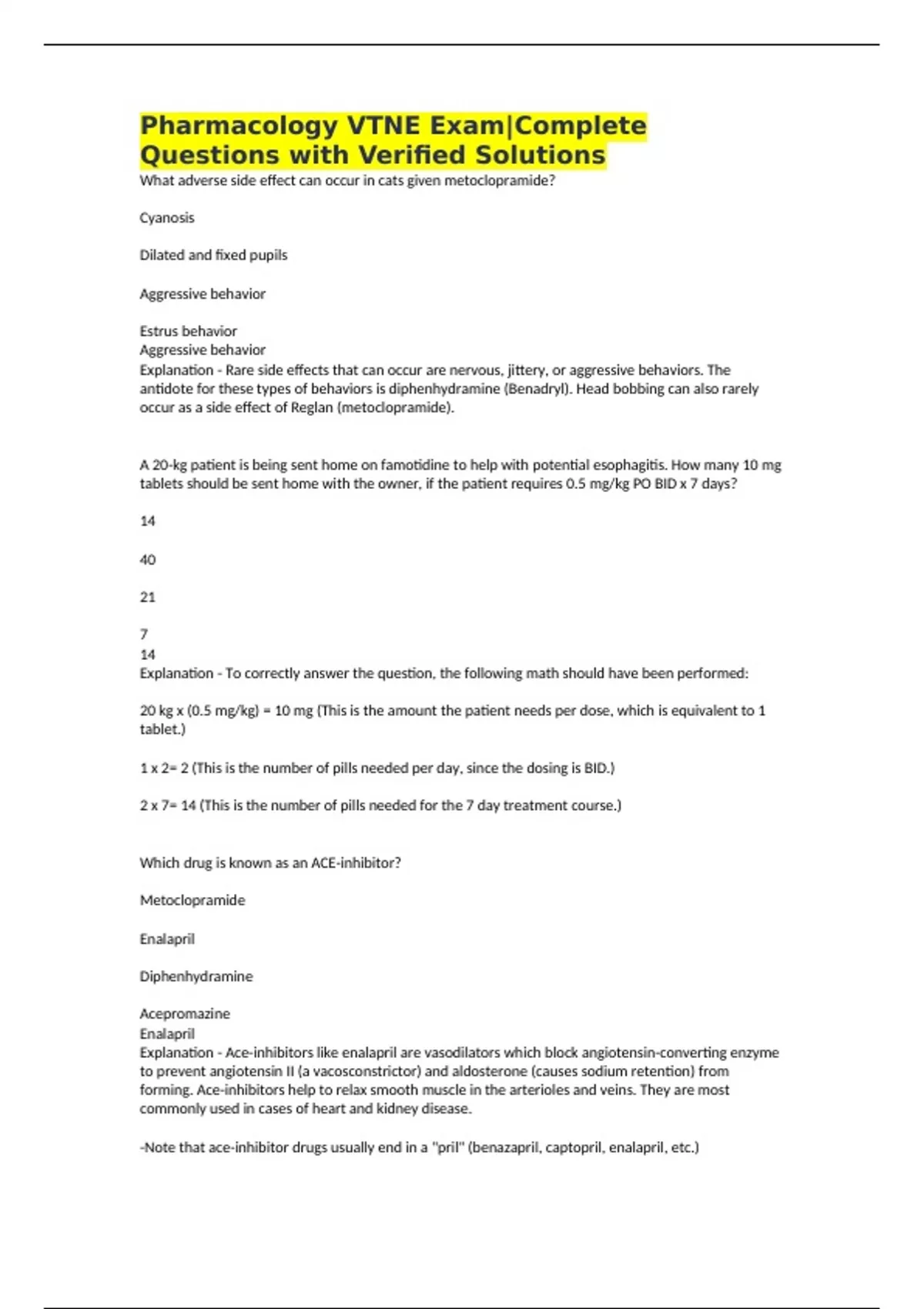 Pharmacology VTNE Exam|Complete Questions with Verified Solutions What adverse side effect can occur in cats given metoclopramide? Cyanosis Dilated and fixed pupils Aggressive behavior Estrus behavior Aggressive behavior Explanation - Rare side effects that can occur are nervous, jittery, or aggressive behaviors. The antidote for these types of behaviors is diphenhydramine (Benadryl). Head bobbing can also rarely occur as a side effect of Reglan (metoclopramide). A 20-kg patient is being sent home on famotidine to help with potential esophagitis. How many 10 mg tablets should be sent home with the owner, if the patient requires 0.5 mg/kg PO BID x 7 days? 14 40 21 7 14 Explanation - To correctly answer the question, the following math should have been performed: 20 kg x (0.5 mg/kg) = 10 mg (This is the amount the patient needs per dose, which is equivalent to 1 tablet.) 1 x 2= 2 (This is the number of pills needed per day, since the dosing is BID.) 2 x 7= 14 (This is the number of pills needed for the 7 day treatment course.) Which drug is known as an ACE-inhibitor? Metoclopramide Enalapril Diphenhydramine Acepromazine Enalapril Explanation - Ace-inhibitors like enalapril are vasodilators which block angiotensin-converting enzyme to prevent angiotensin II (a vacosconstrictor) and aldosterone (causes sodium retention) from forming. Ace-inhibitors help to relax smooth muscle in the arterioles and veins. They are most commonly used in cases of heart and kidney disease. -Note that ace-inhibitor drugs usually end in a "pril" (benazapril, captopril, enalapril, etc.) Valium is often given with ketamine to provide which effect? Increased heart rate Muscle relaxation Increased cardiac contractility Increased muscle tone Muscle relaxation Explanation - Ketamine can cause muscle rigidity. Valium (diazepam) is often given with ketamine to provide muscle relaxation. A 5-year old female spayed Yorkie presents with a history of decreased vision. The doctor asks you to perform tonometry on this dog. Which of the following may be used as a topical anesthetic to the eyes so that you may check the intraocular pressures with your Tonopen? Benzocaine Proparacaine Lidocaine Bupivacaine Proparacaine Explanation - Proparacaine is a topical anesthetic for the eyes. The other choices should not be used in the eyes. The other options are local anesthetic agents but are likely to cause irritation and/or corneal ulceration. Keratoconjunctivitis sicca (dry eye) can result from the use of which medication? Trimethoprim-sulfa (TMS) Enalapril Cyclosporine Prednisone Enrofloxacin Trimethoprim-sulfa (TMS) Explanation - The sulfa drugs can cause dry eye in some patients and therefore overuse should be avoided. If a patient is started on a sulfa drug, tear production should be monitored. Why should atropine, a competitive antagonist of acetylcholine receptors, be used cautiously in horses (i.e. what is a major side effect of the drug)? Excessive use can result in bradycardia Excessive use can result in diarrhea Excessive use can result in intense constriction of the pupil Excessive use can result in intestinal stasis (colic) Excessive use can result in intestinal stasis (colic) Explanation - Atropine is commonly used topically to dilate the pupil in horses with uveitis; with excessive administration, atropine can cause intestinal motility to decrease, possibly resulting in abdominal pain (colic) in the horse. Atropine is also used to increase the heart rate during general anesthesia. Which of these drugs should not be used in Greyhounds? Thiopental Morphine Propofol Ivermectin Thiopental Explanation - The correct answer is thiopental. Thiopental is an ultra-short acting barbiturate. Recovery depends on redistribution to tissues, including fat. Because sighthounds have very little fat, they have prolonged recoveries and greater complications with these drugs. How many milligrams are in 100 ml of a 3% solution? 3 mg 30 mg 0.3 mg 3,000 mg 3,000 mg Explanation - A 3% solution is equal to 30 mg/mL. Now take 100 mL X 30 mg/mL = 3000 mg= 3 grams (since there are 1000 mg in 1 gram) You are working at the specialty center and are observing an echocardiogram for the first time. The cardiologist prescribes the drug propanolol to a canine patient. What effect will this medication have on the heart? Stops ventricular premature contractions Increases the heart rate Slows the heart rate Increases contractility Slows the heart rate Explanation - Propanolol is a Beta-1 and Beta-2 blocker. It blocks the sympathetic nervous system (sympatholytic) which allows for the parasympathetic effects on the heart to dominate. The parasympathetic nervous system slows the heart. Remember- parasympathetic- rest and digest (slower heart rate), and sympathetic- fight or flight (increased heart rate). How many milliliters should be administered to a 100-kg patient that needs 50 mg of a 2.5% solution? 25 ml 2.5 ml 2 ml 125 ml 2 ml Explanation - Percent is equal to weight (in Grams) / 100 parts volume (in mLs) (This is based on water since 1 mL weighs 1 Gram): Example: A 3% solution: 3 Grams / 100 mL or 3000 mg / 100 mL or 30 mg/mL The easiest way to remember is to just add a zero onto any percentage for the milligrams (i.e. 2% solution = 20 mg/ml; 10% solution = 100 mg/ml, etc.) In this situation a 2.5% solution is equivalent to 25 mg/ml. Therefore: 50 mg / (25 mg/ml) = 2 ml A 2-year old domestic short hair cat presents for ingestion of tiger lillies. The ingestion occurred about 2 hours ago and no clinical signs have been noted yet. What does the ingestion of this plant cause in cats? Renal failure Seizures Muscle paralysis Hypoglycemia Renal failure Explanation - The flowers are Tiger Lilies. Lilies of all different varieties as well as their leaves cause acute renal failure in cats when ingested. Treatment is similar to any other cause for renal failure and includes high rates of IV fluids, supportive medications, and occasionally diuretics such as furosemi