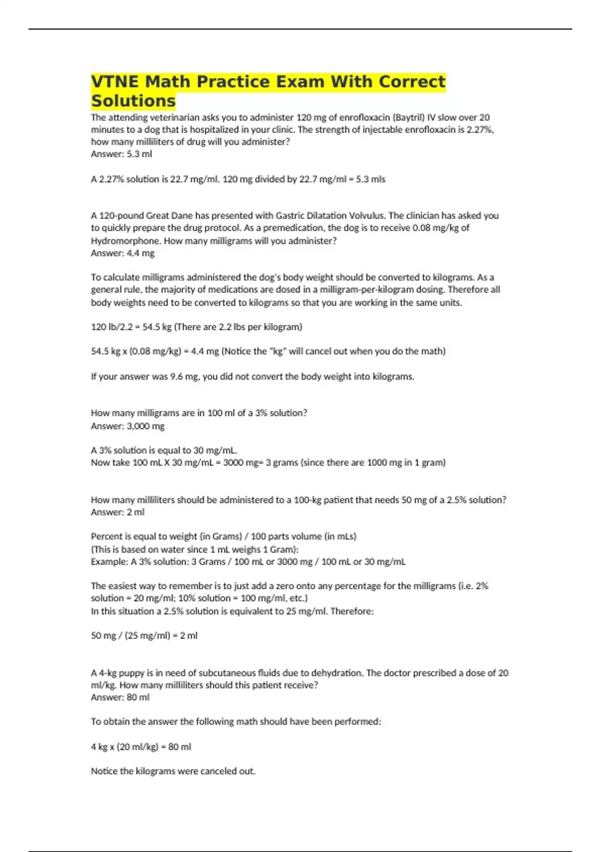 VTNE Math Practice Exam With Correct Solutions The attending veterinarian asks you to administer 120 mg of enrofloxacin (Baytril) IV slow over 20 minutes to a dog that is hospitalized in your clinic. The strength of injectable enrofloxacin is 2.27%, how many milliliters of drug will you administer? Answer: 5.3 ml A 2.27% solution is 22.7 mg/ml. 120 mg divided by 22.7 mg/ml = 5.3 mls A 120-pound Great Dane has presented with Gastric Dilatation Volvulus. The clinician has asked you to quickly prepare the drug protocol. As a premedication, the dog is to receive 0.08 mg/kg of Hydromorphone. How many milligrams will you administer? Answer: 4.4 mg To calculate milligrams administered the dog's body weight should be converted to kilograms. As a general rule, the majority of medications are dosed in a milligram-per-kilogram dosing. Therefore all body weights need to be converted to kilograms so that you are working in the same units. 120 lb/2.2 = 54.5 kg (There are 2.2 lbs per kilogram) 54.5 kg x (0.08 mg/kg) = 4.4 mg (Notice the "kg" will cancel out when you do the math) If your answer was 9.6 mg, you did not convert the body weight into kilograms. How many milligrams are in 100 ml of a 3% solution? Answer: 3,000 mg A 3% solution is equal to 30 mg/mL. Now take 100 mL X 30 mg/mL = 3000 mg= 3 grams (since there are 1000 mg in 1 gram) How many milliliters should be administered to a 100-kg patient that needs 50 mg of a 2.5% solution? Answer: 2 ml Percent is equal to weight (in Grams) / 100 parts volume (in mLs) (This is based on water since 1 mL weighs 1 Gram): Example: A 3% solution: 3 Grams / 100 mL or 3000 mg / 100 mL or 30 mg/mL The easiest way to remember is to just add a zero onto any percentage for the milligrams (i.e. 2% solution = 20 mg/ml; 10% solution = 100 mg/ml, etc.) In this situation a 2.5% solution is equivalent to 25 mg/ml. Therefore: 50 mg / (25 mg/ml) = 2 ml A 4-kg puppy is in need of subcutaneous fluids due to dehydration. The doctor prescribed a dose of 20 ml/kg. How many milliliters should this patient receive? Answer: 80 ml To obtain the answer the following math should have been performed: 4 kg x (20 ml/kg) = 80 ml Notice the kilograms were canceled out. A dog presents with a history of coughing and rapid breathing. Radiographs confirm congestive heart failure (see image). You are asked to administer 2 mg/kg of furosemide IV. The concentration of furosemide is 50 mg/mL. The dog weighs 25 pounds. How many milliliters should you administer to this patient? Answer: 0.44 mL The dog is 25 pounds. 25 pounds/2.2 pounds per kg= 11.3 kg Now multiply the dog's weight in kg by the dose you need (2mg/kg): 11kg X 2mg = 22 mg The dog needs 22 mg. Now divide this dose by the concentration of furosemide (50 mg/mL): 22mg/ 50 = 0.44 mL You are instructed to administer 12 liters of sterile isotonic IV fluids via a fluid pump over the next 24 hours. What is the appropriate fluid rate to administer this volume of IV fluids? Answer: 500 mL/hour 12 liters (12000 mLs) divided by 24 hours would equal 500 mLs/hour. A 12 pound dog comes into the clinic with a history of vomiting for the last 24 hours. The doctor asks you to give an injection of Cerenia (maropitant) at a dose of 0.45mg/lb. Cerenia has a concentration of 10mg/ml. How many milliliters will be given to the dog? Answer: 0.54 mls (12lb) X (0.45mg/lb)=5.4mg (lbs cancel) 5.4mg divided by 10mg/ml=0.54mls (the milligrams cancel) A 60-kg dog needs to be sedated with dexmedetomidine and butorphanol. The doctor would like a dose of 10 ug/kg for dexmedetomidine and 0.1 mg/kg for butorphanol. Dexmedetomidine comes in a 1 mg/ml solution, and butorphanol is in a 10 mg/ml solution. How many milliliters of each medication will need to be administered for the patient's sedation? Answer: 0.6 ml of dexmedetomidine and 0.6 ml of butorphanol For dexmedetomidine, do the following math: 60 kg x (10 ug/kg) = 600 ug Note the units and convert to work with milligrams as the solution is in milligrams per milliliter. 600 ug / (1000 mg/ug) = 0.6 mg 0.6 mg / (1 mg/ml) = 0.6 ml For butorphanol, do the following math: 60 kg x 0.1 mg/kg = 6 mg 6 mg / (10 mg/ml) = 0.6 ml A 13.2-lb cat is being sent home with an oral solution of Tramadol for post-operative pain control. At a dose of 3 mg/kg, how many milliliters should be given if the solution comes in a 5 mg/ml concentration? Answer: 3.6 ml First, convert pounds to kilograms. 13.2 / (2.2 lb/kg) = 6 kg Then calculate milligrams necessary. 6 kg x 3 mg/ml = 18 mg Finally, calculate milliliters necessary. 18 mg / (5 mg/ml) = 3.6 ml A 60-lb patient is to go home on Clavamox after his dental cleaning. The dose is 14 mg/kg. What size tablet should the patient be sent home with? Answer: 375 mg After converting the body weight to kilograms the dose needs to be multiplied by the body weight. 60 lb / (2.2 lb/kg) = 27 kg (Notice the pounds cancel out) 27 kg x 14= 378 mg Many medications are available in different concentrations to accommodate different sized patients. This is particularly the case with oral medications so that owners don't have to worry about trying to halve or quarter medications. A 20-kg patient is currently receiving 52 ml/hr of Lactated Ringer's Solution. The clinician has requested that 2 mg/kg/day of metoclopramide be added to the bag. Metoclopramide is available as a 5 mg/ml solution. How many milliliters do you need to add to a 1 liter bag? Answer: 6.5 ml This is definitely a more complicated calculation question, but when broken down it is not insurmountable. A 20-kg patient will need 40 mg/day of metoclopramide (20 kg x 2 mg/kg/day) Since the fluid is being administered at an hourly rate, we need to figure out how much metoclopramide we are administering per hour. 40 mg/day / (24 hr) = 1.7 mg/hr To determine how much volume of metoclopramide is needed, the following math is performed: 1.7 mg/hr / (52 ml/hr) x (1000 ml)= 32.6 mg (Notice how the units cancel out.) 32.6 mg / (5 mg/ml) = 6.5 ml A 10 kg Miniat
