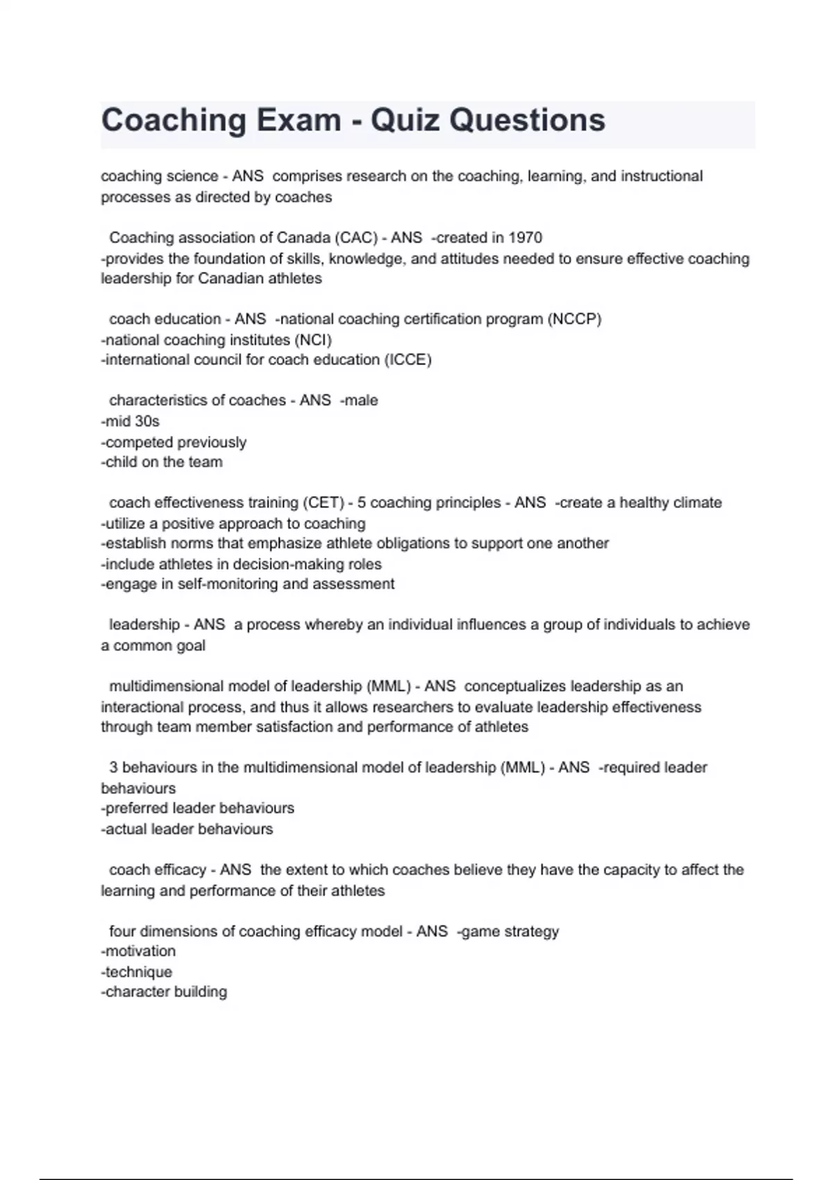 Coaching Exam - Quiz Questions coaching science - ANS comprises research on the coaching, learning, and instructional processes as directed by coaches Coaching association of Canada (CAC) - ANS -created in 1970 -provides the foundation of skills, knowledge, and attitudes needed to ensure effective coaching leadership for Canadian athletes coach education - ANS -national coaching certification program (NCCP) -national coaching institutes (NCI) -international council for coach education (ICCE) characteristics of coaches - ANS -male -mid 30s -competed previously -child on the team coach effectiveness training (CET) - 5 coaching principles - ANS -create a healthy climate -utilize a positive approach to coaching -establish norms that emphasize athlete obligations to support one another -include athletes in decision-making roles -engage in self-monitoring and assessment leadership - ANS a process whereby an individual influences a group of individuals to achieve a common goal multidimensional model of leadership (MML) - ANS conceptualizes leadership as an interactional process, and thus it allows researchers to evaluate leadership effectiveness through team member satisfaction and performance of athletes 3 behaviours in the multidimensional model of leadership (MML) - ANS -required leader behaviours -preferred leader behaviours -actual leader behaviours coach efficacy - ANS the extent to which coaches believe they have the capacity to affect the learning and performance of their athletes four dimensions of coaching efficacy model - ANS -game strategy -motivation -technique -character building sources that affect coaching efficacy - ANS -previous expereinces and preparation -previous level of success -perceived skill of the athletes -the level of community support coaching model - ANS infers that coaches begin their job by developing a mental model of the potential of their athletes or teams peripheral components of the coaching model - ANS -coach's personal characteristics (perceptions, beliefs) -athlete's personal characteristics (abilities, stage of learning) -contextual factors (salary, job security)