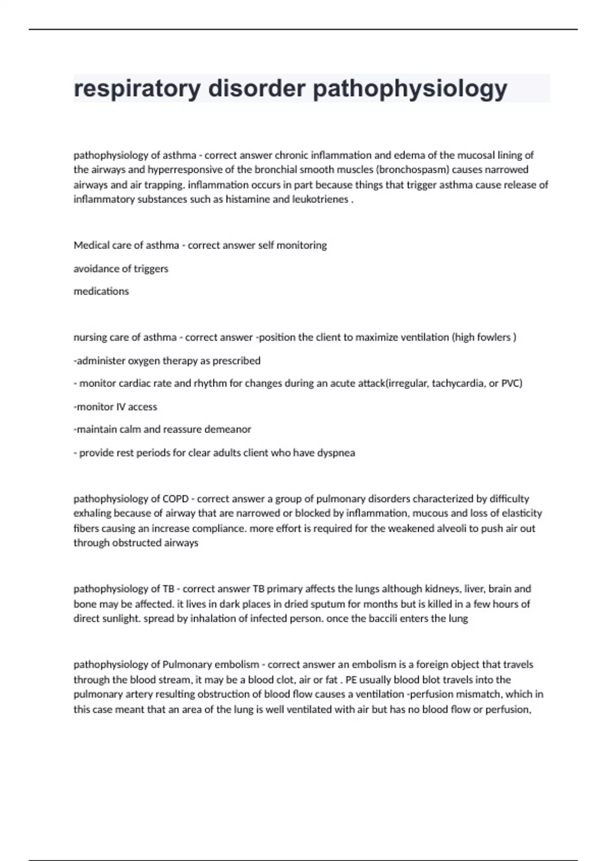 respiratory disorder pathophysiologypathophysiology of asthma - correct answer chronic inflammation and edema of the mucosal lining of the airways and hyperresponsive of the bronchial smooth muscles (bronchospasm) causes narrowed airways and air trapping. inflammation occurs in part because things that trigger asthma cause release of inflammatory substances such as histamine and leukotrienes . Medical care of asthma - correct answer self monitoring avoidance of triggers medications nursing care of asthma - correct answer -position the client to maximize ventilation (high fowlers ) -administer oxygen therapy as prescribed - monitor cardiac rate and rhythm for changes during an acute attack(irregular, tachycardia, or PVC) -monitor IV access -maintain calm and reassure demeanor - provide rest periods for clear adults client who have dyspnea pathophysiology of COPD - correct answer a group of pulmonary disorders characterized by difficulty exhaling because of airway that are narrowed or blocked by inflammation, mucous and loss of elasticity fibers causing an increase compliance. more effort is required for the weakened alveoli to push air out through obstructed airways pathophysiology of TB - correct answer TB primary affects the lungs although kidneys, liver, brain and bone may be affected. it lives in dark places in dried sputum for months but is killed in a few hours of direct sunlight. spread by inhalation of infected person. once the baccili enters the lung pathophysiology of Pulmonary embolism - correct answer an embolism is a foreign object that travels through the blood stream, it may be a blood clot, air or fat . PE usually blood blot travels into the pulmonary artery resulting obstruction of blood flow causes a ventilation -perfusion mismatch, which in this case meant that an area of the lung is well ventilated with air but has no blood flow or perfusion,