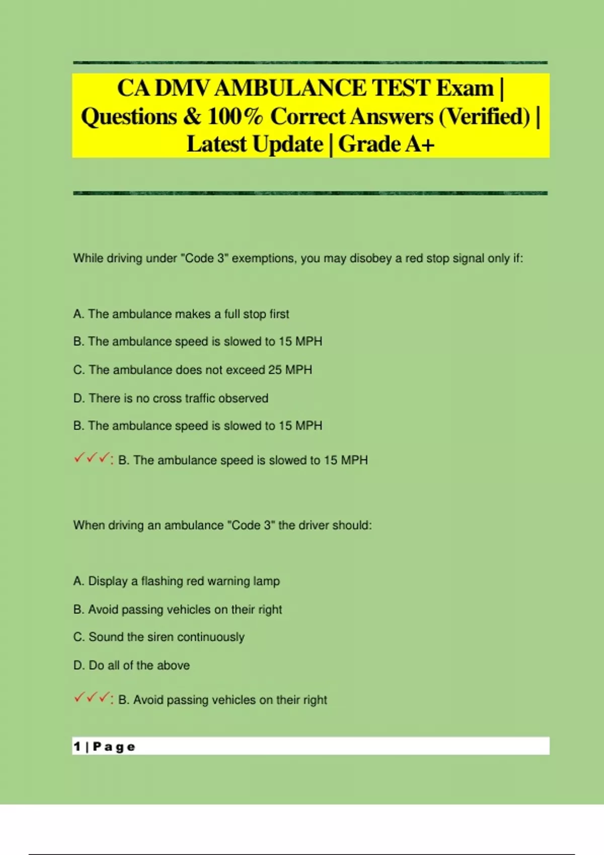 CA DMV AMBULANCE TEST Exam | Questions & 100% Correct Answers (Verified) | Latest Update | Grade A+