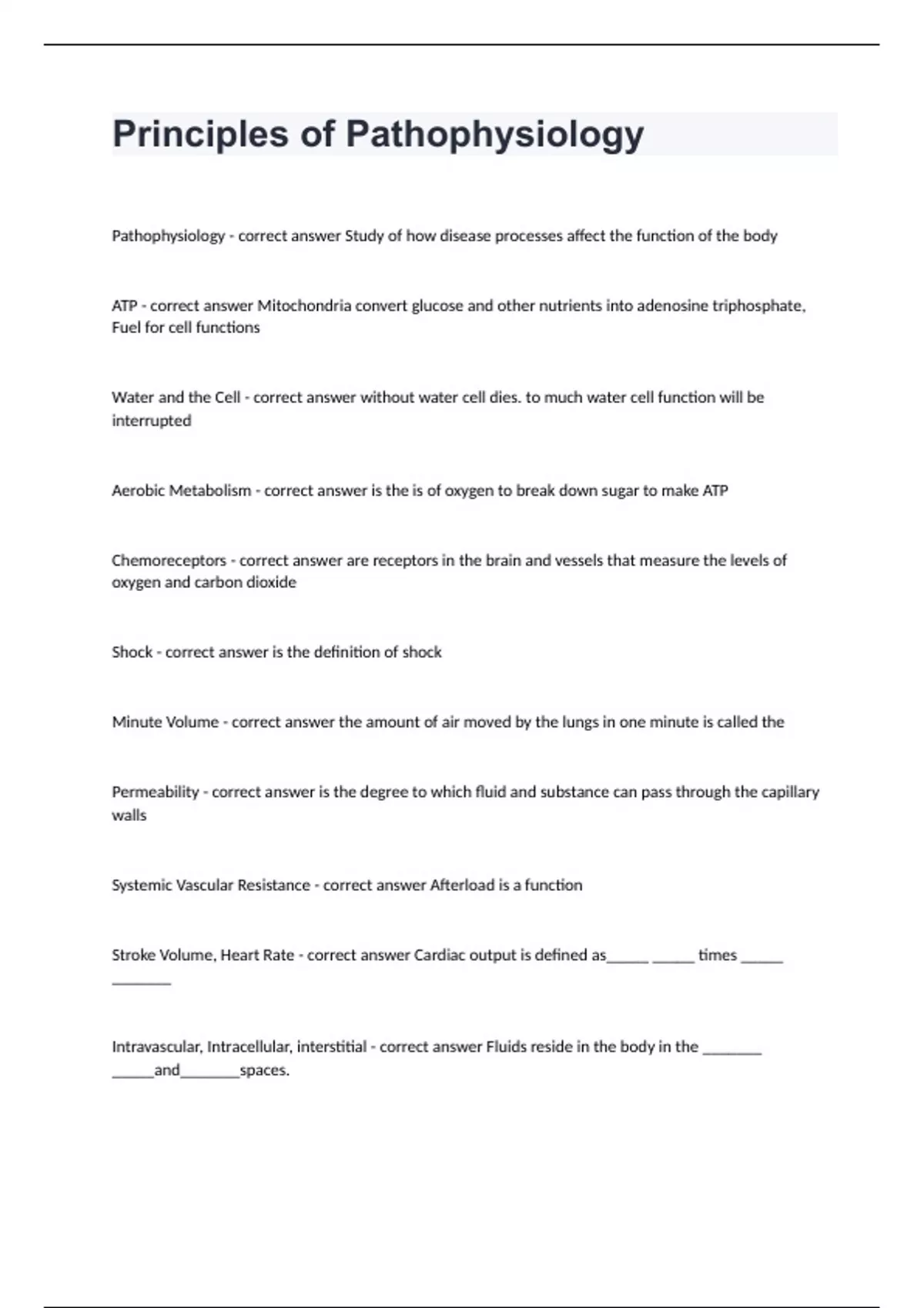 Principles of PathophysiologyPathophysiology - correct answer Study of how disease processes affect the function of the body ATP - correct answer Mitochondria convert glucose and other nutrients into adenosine triphosphate, Fuel for cell functions Water and the Cell - correct answer without water cell dies. to much water cell function will be interrupted Aerobic Metabolism - correct answer is the is of oxygen to break down sugar to make ATP Chemoreceptors - correct answer are receptors in the brain and vessels that measure the levels of oxygen and carbon dioxide Shock - correct answer is the definition of shock Minute Volume - correct answer the amount of air moved by the lungs in one minute is called the Permeability - correct answer is the degree to which fluid and substance can pass through the capillary walls Systemic Vascular Resistance - correct answer Afterload is a function Stroke Volume, Heart Rate - correct answer Cardiac output is defined as_____ _____ times _____ _______ Intravascular, Intracellular, interstitial - correct answer Fluids reside in the body in the _______ _____and_______spaces.