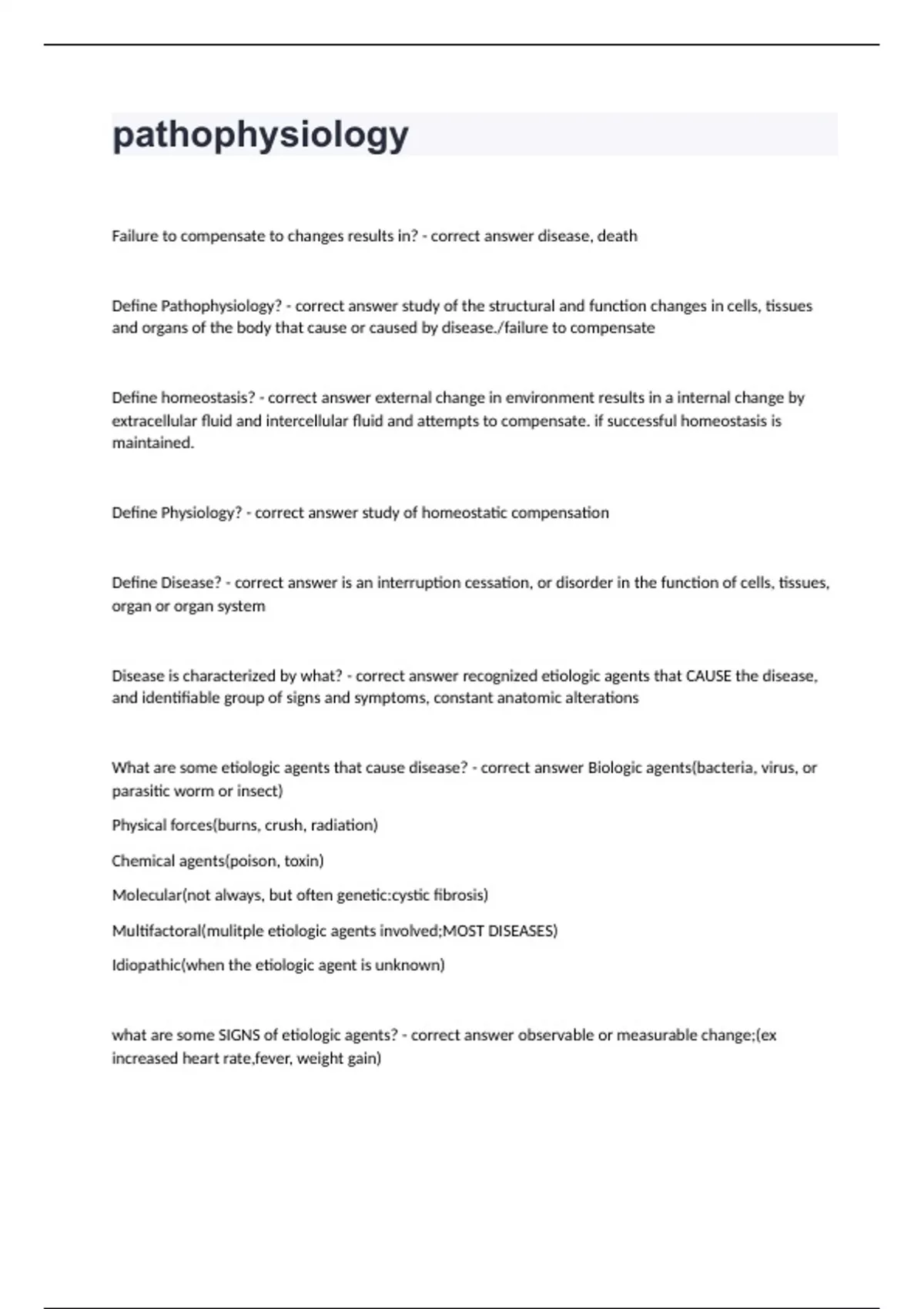 pathophysiologyFailure to compensate to changes results in? - correct answer disease, death Define Pathophysiology? - correct answer study of the structural and function changes in cells, tissues and organs of the body that cause or caused by disease./failure to compensate Define homeostasis? - correct answer external change in environment results in a internal change by extracellular fluid and intercellular fluid and attempts to compensate. if successful homeostasis is maintained. Define Physiology? - correct answer study of homeostatic compensation Define Disease? - correct answer is an interruption cessation, or disorder in the function of cells, tissues, organ or organ system Disease is characterized by what? - correct answer recognized etiologic agents that CAUSE the disease, and identifiable group of signs and symptoms, constant anatomic alterations What are some etiologic agents that cause disease? - correct answer Biologic agents(bacteria, virus, or parasitic worm or insect) Physical forces(burns, crush, radiation) Chemical agents(poison, toxin) Molecular(not always, but often genetic:cystic fibrosis) Multifactoral(mulitple etiologic agents involved;MOST DISEASES) Idiopathic(when the etiologic agent is unknown) what are some SIGNS of etiologic agents? - correct answer observable or measurable change;(ex increased heart rate,fever, weight gain) What are some SYMPTOMS of etiologic agents? - correct answer unobservable effects of a disease REPORTED BY PATIENT(ex: pain, difficulty breathing, dizziness) What are some SYNDROME characteristics of etiologic agents? - correct answer characteristics combo of signs and symptoms associated with a particular disease. What is another way to categorize etiology? - correct answer based on timing: Congenital and Acquired Define Congenital timing of etiologic agents? - correct answer disease condition is PRESENT AT BIRTH, although may not become evident until much later(ex: Molecular-down syndrome, cystic fibrosis, sickle cell anemia) may be due to mother being exposed during preg(infected mother with german measles causes baby to have deafness, cataracts and heart disease) Define Acquired timing of etiologic agents? - correct answer disease is caused by events AFTER BIRTH. (ex: result of genetic predisposition combined with exposure to a different etiologic agent-asthma(genetic and exposure to certain mites) Define pathogenesis? - correct answer the sequence of cellular or tissue events that take place in time from the initial contact with the etiologic agent until the ultimate expressions of a disease or the development of the disease. IT IS THE PATTERN OF PROGRESSION. EX: Atherosclerosis(coronary artery disease) Define morphology? - correct answer refers to fundamental structure(how something looks) of cells tissues or organs. Define Morphologic changes? - correct answer are gross anatomic or microscopic changes characteristic of a particular disease. ex: LESIONS Where are distributions of lesions within the body? - correct answer Local-confined to one area of the