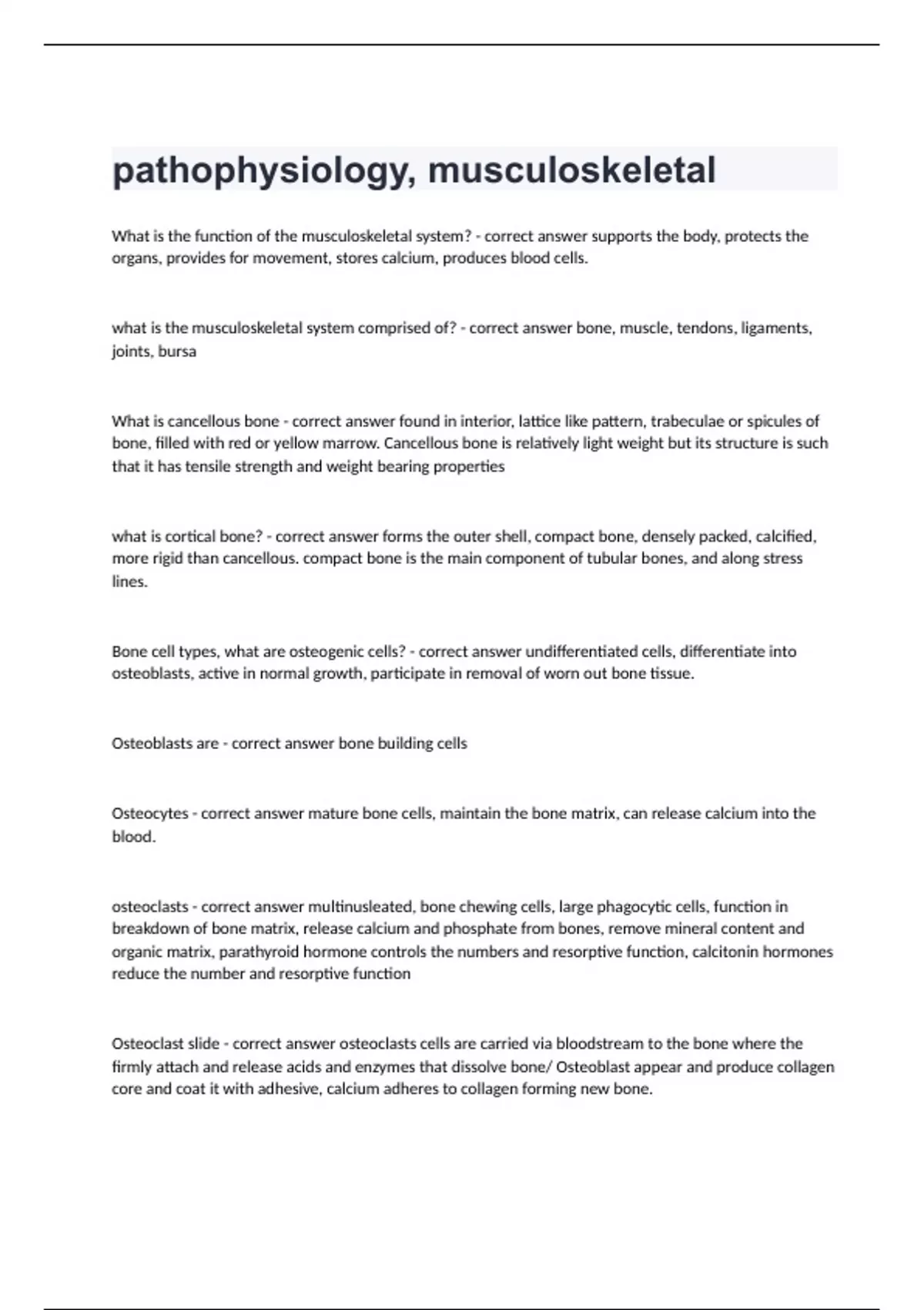 pathophysiology, musculoskeletal What is the function of the musculoskeletal system? - correct answer supports the body, protects the organs, provides for movement, stores calcium, produces blood cells. what is the musculoskeletal system comprised of? - correct answer bone, muscle, tendons, ligaments, joints, bursa What is cancellous bone - correct answer found in interior, lattice like pattern, trabeculae or spicules of bone, filled with red or yellow marrow. Cancellous bone is relatively light weight but its structure is such that it has tensile strength and weight bearing properties what is cortical bone? - correct answer forms the outer shell, compact bone, densely packed, calcified, more rigid than cancellous. compact bone is the main component of tubular bones, and along stress lines. Bone cell types, what are osteogenic cells? - correct answer undifferentiated cells, differentiate into osteoblasts, active in normal growth, participate in removal of worn out bone tissue. Osteoblasts are - correct answer bone building cells Osteocytes - correct answer mature bone cells, maintain the bone matrix, can release calcium into the blood. osteoclasts - correct answer multinusleated, bone chewing cells, large phagocytic cells, function in breakdown of bone matrix, release calcium and phosphate from bones, remove mineral content and organic matrix, parathyroid hormone controls the numbers and resorptive function, calcitonin hormones reduce the number and resorptive function Osteoclast slide - correct answer osteoclasts cells are carried via bloodstream to the bone where the firmly attach and release acids and enzymes that dissolve bone/ Osteoblast appear and produce collagen core and coat it with adhesive, calcium adheres to collagen forming new bone.