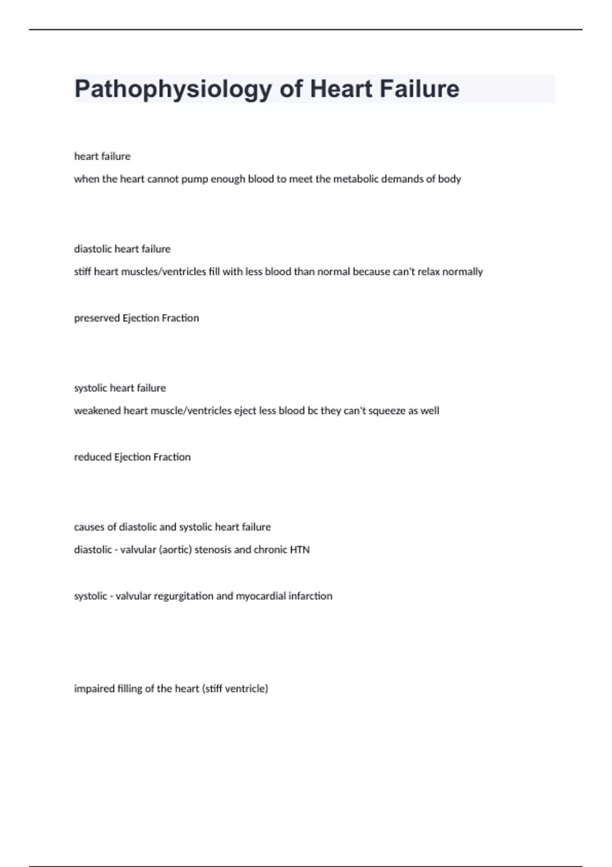 Pathophysiology of Heart Failureheart failure when the heart cannot pump enough blood to meet the metabolic demands of body diastolic heart failure stiff heart muscles/ventricles fill with less blood than normal because can't relax normally preserved Ejection Fraction systolic heart failure weakened heart muscle/ventricles eject less blood bc they can't squeeze as well reduced Ejection Fraction causes of diastolic and systolic heart failure diastolic - valvular (aortic) stenosis and chronic HTN systolic - valvular regurgitation and myocardial infarction impaired filling of the heart (stiff ventricle)