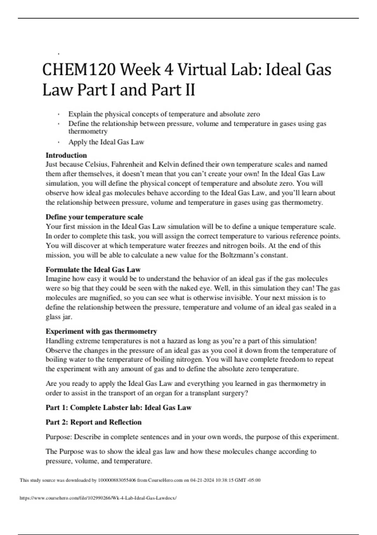 CHEM120 Week 4 Virtual Lab: Ideal Gas Law Part I and Part II
