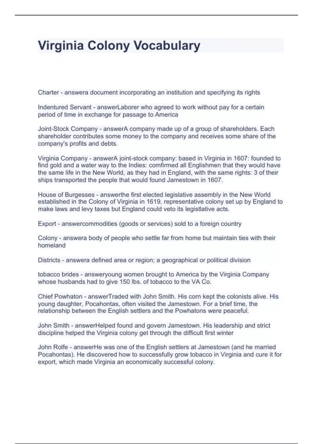 Virginia Colony Vocabulary Questions and Answers 2024