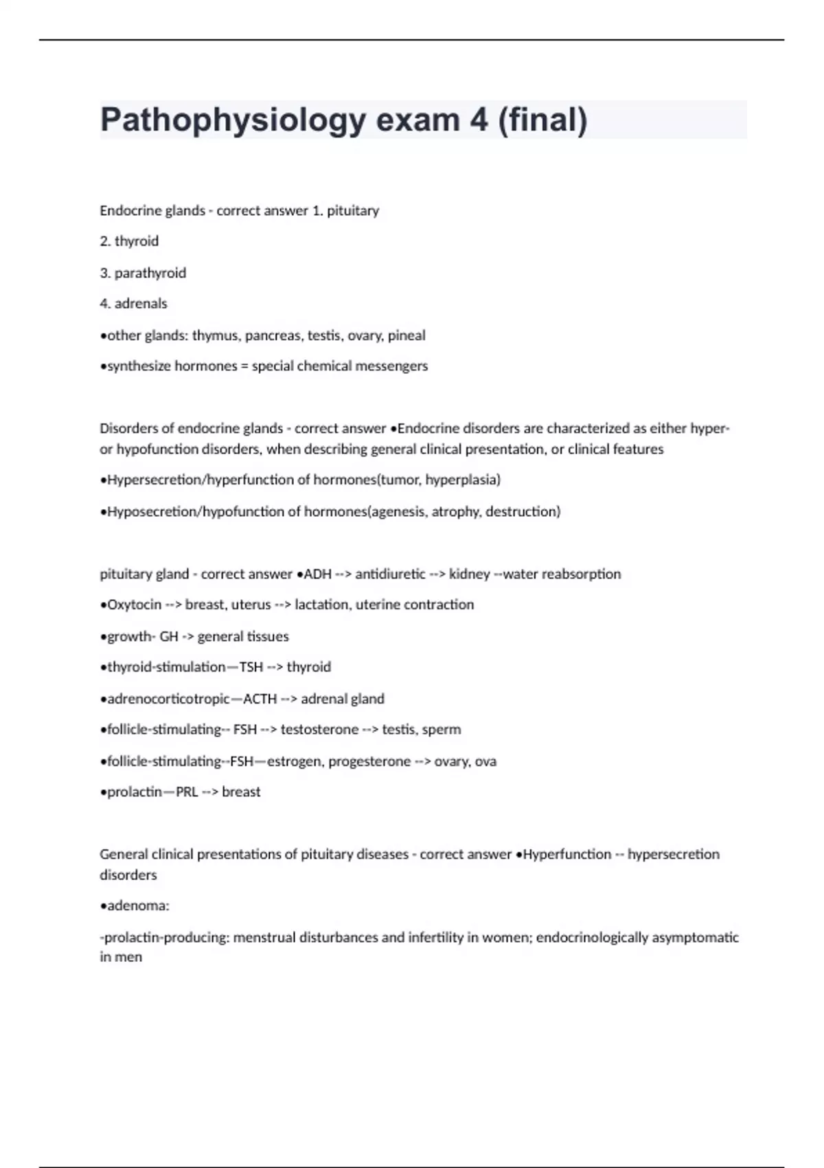 Pathophysiology exam 4 (final) Endocrine glands - correct answer 1. pituitary 2. thyroid 3. parathyroid 4. adrenals •other glands: thymus, pancreas, testis, ovary, pineal •synthesize hormones = special chemical messengers Disorders of endocrine glands - correct answer •Endocrine disorders are characterized as either hyper- or hypofunction disorders, when describing general clinical presentation, or clinical features •Hypersecretion/hyperfunction of hormones(tumor, hyperplasia) •Hyposecretion/hypofunction of hormones(agenesis, atrophy, destruction) pituitary gland - correct answer •ADH --> antidiuretic --> kidney --water reabsorption •Oxytocin --> breast, uterus --> lactation, uterine contraction •growth- GH -> general tissues •thyroid-stimulation—TSH --> thyroid •adrenocorticotropic—ACTH --> adrenal gland •follicle-stimulating-- FSH --> testosterone --> testis, sperm •follicle-stimulating--FSH—estrogen, progesterone --> ovary, ova •prolactin—PRL --> breast General clinical presentations of pituitary diseases - correct answer •Hyperfunction -- hypersecretion disorders •adenoma: -prolactin-producing: menstrual disturbances and infertility in women; endocrinologically asymptomatic in men