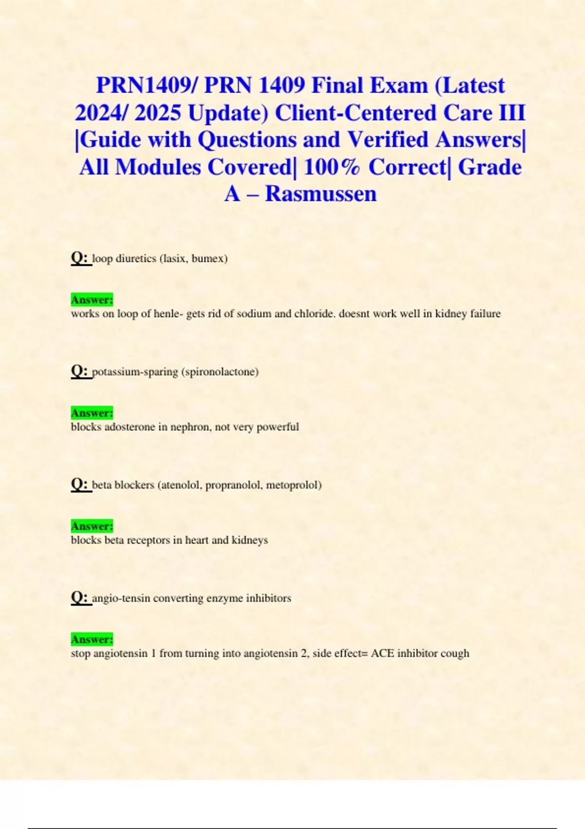 PRN1409/ PRN 1409 Final Exam (Latest 2024/ 2025 Update) Client-Centered Care III |Guide with Questions and Verified Answers| All Modules Covered| 100% Correct| Grade A – Rasmussen Q: loop diuretics (lasix, bumex) Answer: works on loop of henle- gets rid of sodium and chloride. doesnt work well in kidney failure Q: potassium-sparing (spironolactone) Answer: blocks adosterone in nephron, not very powerful Q: beta blockers (atenolol, propranolol, metoprolol) Answer: blocks beta receptors in heart and kidneys Q: angio-tensin converting enzyme inhibitors Answer: stop angiotensin 1 from turning into angiotensin 2, side effect= ACE inhibitor cough Q: calcium channel blockers Answer: block calcium channels causing arterioles to dilate Q: arteriosclerosis Answer: hardening of the arteries, occurs mostly from aging Q: atherosclerosis Answer: occurs when plaques form on the inside of arteries. can build up enough to occlude the vessel cutting off blood flow completely Q: peripheral vascular disease Answer: narrowing, obstruction, or spasms of the peripheral blood vessels Q: what is a major risk factor of PVD Answer: diabetes Q: Other causes of PVD include Answer: raynauds disease, aneuryms, trauma to vessel, embolisms Q: Peripheral artery disease is caused by Answer: atherosclerosis Q: PAD symptoms Answer: pain when walking, legs appear darker red Q: hyperbaric oxygen Answer: treatment in a chamber that has o2 under pressure Q: treatment of PAD Answer: walking, angioplasty, stents, bypass surgery Q: clots can be removed surgically or treated with Answer: thrombolytics