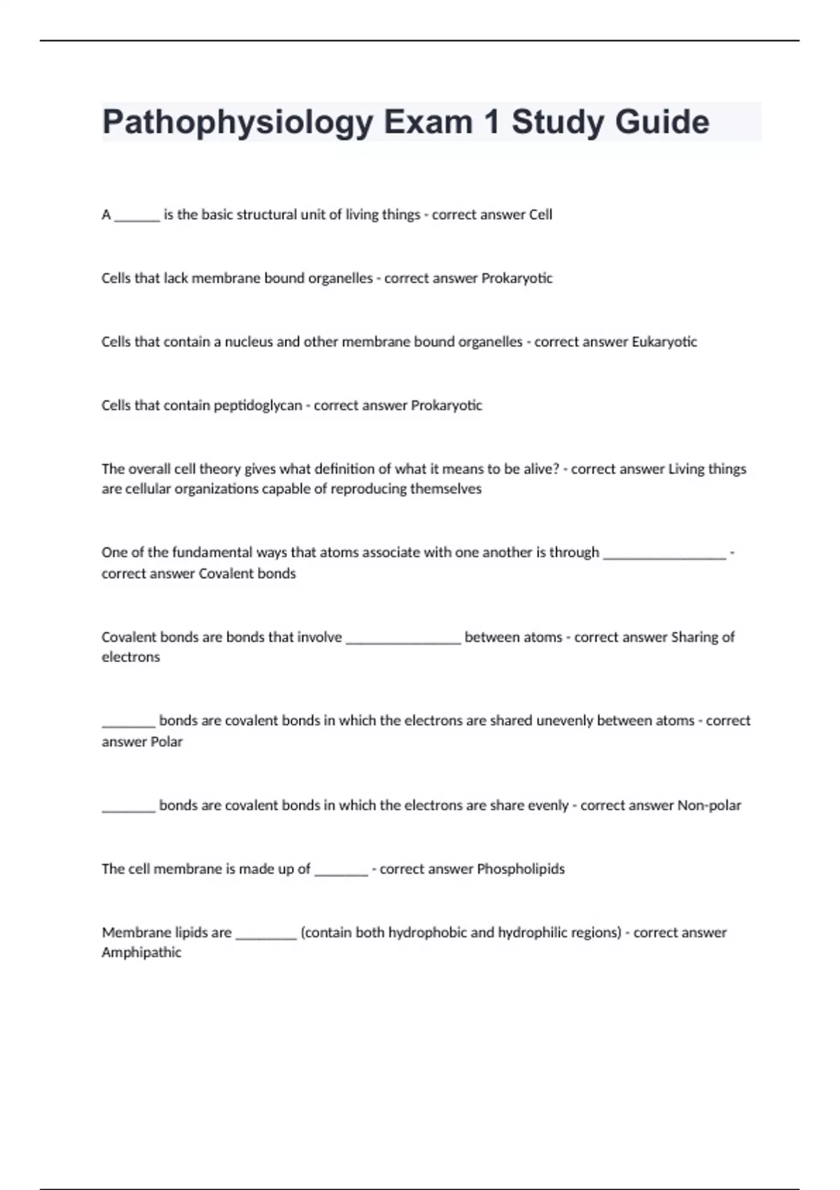 Pathophysiology Exam 1 Study GuideA ______ is the basic structural unit of living things - correct answer Cell Cells that lack membrane bound organelles - correct answer Prokaryotic Cells that contain a nucleus and other membrane bound organelles - correct answer Eukaryotic Cells that contain peptidoglycan - correct answer Prokaryotic The overall cell theory gives what definition of what it means to be alive? - correct answer Living things are cellular organizations capable of reproducing themselves One of the fundamental ways that atoms associate with one another is through ________________ - correct answer Covalent bonds Covalent bonds are bonds that involve _______________ between atoms - correct answer Sharing of electrons _______ bonds are covalent bonds in which the electrons are shared unevenly between atoms - correct answer Polar _______ bonds are covalent bonds in which the electrons are share evenly - correct answer Non-polar The cell membrane is made up of _______ - correct answer Phospholipids Membrane lipids are ________ (contain both hydrophobic and hydrophilic regions) - correct answer Amphipathic