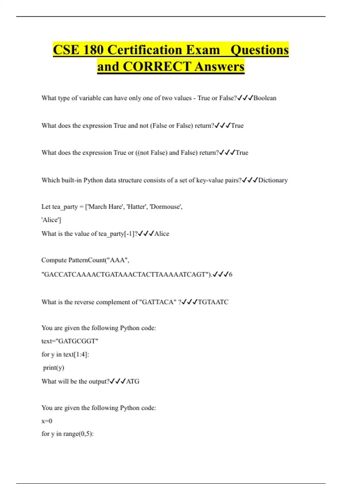 What type of variable can have only one of two values - True or False?Boolean What does the expression True and not (False or False) return?True What does the expression True or ((not False) and False) return?True Which built-in Python data structure consists of a set of key-value pairs?Dictionary Let tea_party = ['March Hare', 'Hatter', 'Dormouse', 'Alice'] What is the value of tea_party[-1]?Alice Compute PatternCount("AAA", "GACCATCAAAACTGATAAACTACTTAAAAATCAGT").6