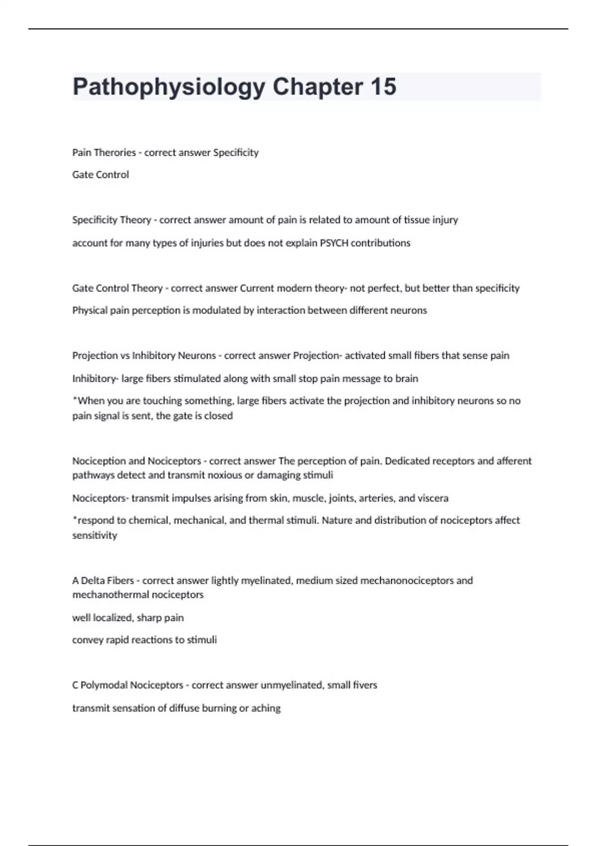 Pathophysiology Chapter 15Pain Therories - correct answer Specificity Gate Control Specificity Theory - correct answer amount of pain is related to amount of tissue injury account for many types of injuries but does not explain PSYCH contributions Gate Control Theory - correct answer Current modern theory- not perfect, but better than specificity Physical pain perception is modulated by interaction between different neurons Projection vs Inhibitory Neurons - correct answer Projection- activated small fibers that sense pain Inhibitory- large fibers stimulated along with small stop pain message to brain *When you are touching something, large fibers activate the projection and inhibitory neurons so no pain signal is sent, the gate is closed Nociception and Nociceptors - correct answer The perception of pain. Dedicated receptors and afferent pathways detect and transmit noxious or damaging stimuli Nociceptors- transmit impulses arising from skin, muscle, joints, arteries, and viscera *respond to chemical, mechanical, and thermal stimuli. Nature and distribution of nociceptors affect sensitivity A Delta Fibers - correct answer lightly myelinated, medium sized mechanonociceptors and mechanothermal nociceptors well localized, sharp pain convey rapid reactions to stimuli C Polymodal Nociceptors - correct answer unmyelinated, small fivers transmit sensation of diffuse burning or aching slow pain