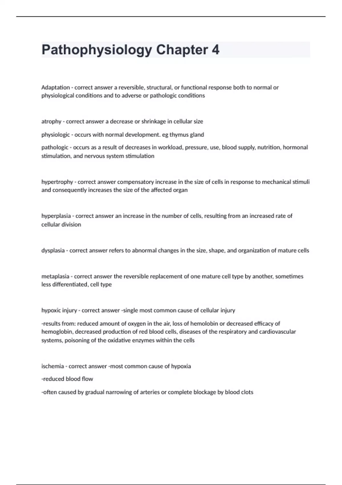 Pathophysiology Chapter 4Adaptation - correct answer a reversible, structural, or functional response both to normal or physiological conditions and to adverse or pathologic conditions atrophy - correct answer a decrease or shrinkage in cellular size physiologic - occurs with normal development. eg thymus gland pathologic - occurs as a result of decreases in workload, pressure, use, blood supply, nutrition, hormonal stimulation, and nervous system stimulation hypertrophy - correct answer compensatory increase in the size of cells in response to mechanical stimuli and consequently increases the size of the affected organ hyperplasia - correct answer an increase in the number of cells, resulting from an increased rate of cellular division dysplasia - correct answer refers to abnormal changes in the size, shape, and organization of mature cells metaplasia - correct answer the reversible replacement of one mature cell type by another, sometimes less differentiated, cell type hypoxic injury - correct answer -single most common cause of cellular injury -results from: reduced amount of oxygen in the air, loss of hemolobin or decreased efficacy of hemoglobin, decreased production of red blood cells, diseases of the respiratory and cardiovascular systems, poisoning of the oxidative enzymes within the cells ischemia - correct answer -most common cause of hypoxia -reduced blood flow -often caused by gradual narrowing of arteries or complete blockage by blood clots
