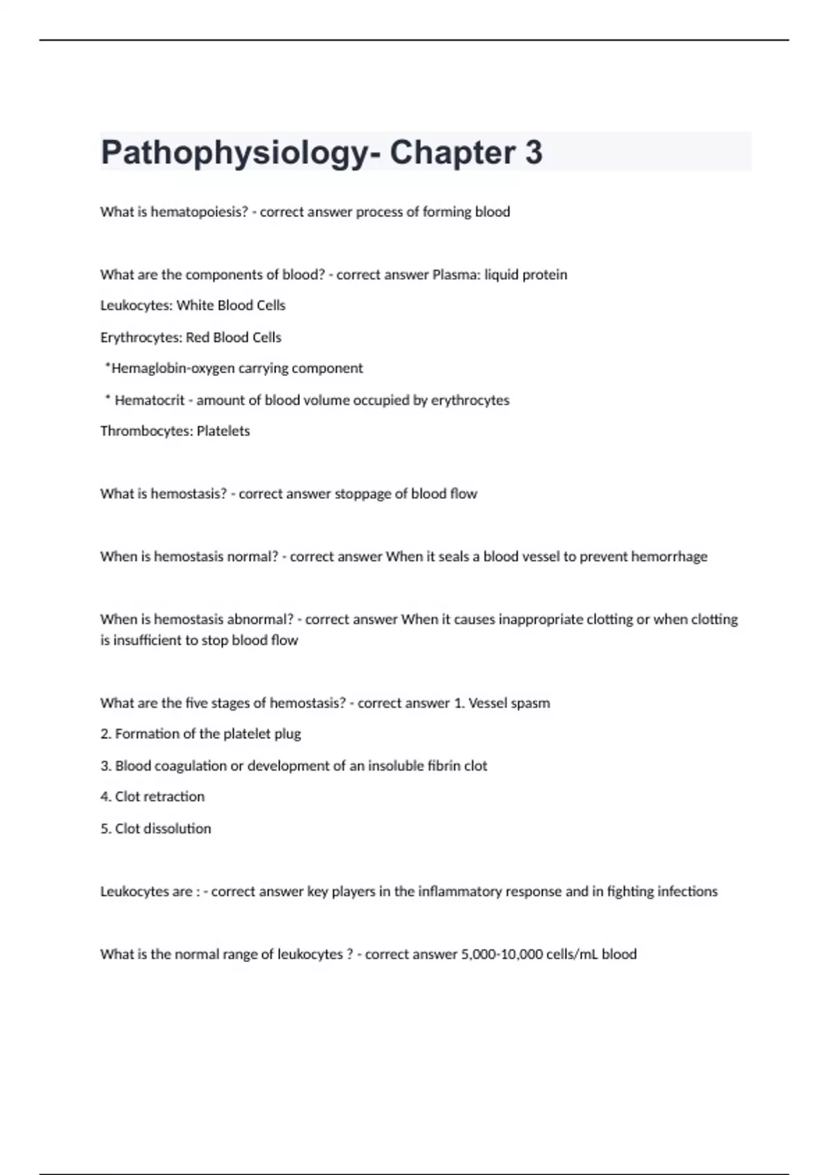 Pathophysiology- Chapter 3What is hematopoiesis? - correct answer process of forming blood What are the components of blood? - correct answer Plasma: liquid protein Leukocytes: White Blood Cells Erythrocytes: Red Blood Cells *Hemaglobin-oxygen carrying component * Hematocrit - amount of blood volume occupied by erythrocytes Thrombocytes: Platelets What is hemostasis? - correct answer stoppage of blood flow When is hemostasis normal? - correct answer When it seals a blood vessel to prevent hemorrhage When is hemostasis abnormal? - correct answer When it causes inappropriate clotting or when clotting is insufficient to stop blood flow What are the five stages of hemostasis? - correct answer 1. Vessel spasm 2. Formation of the platelet plug 3. Blood coagulation or development of an insoluble fibrin clot 4. Clot retraction 5. Clot dissolution Leukocytes are : - correct answer key players in the inflammatory response and in fighting infections What is the normal range of leukocytes ? - correct answer 5,000-10,000 cells/mL blood