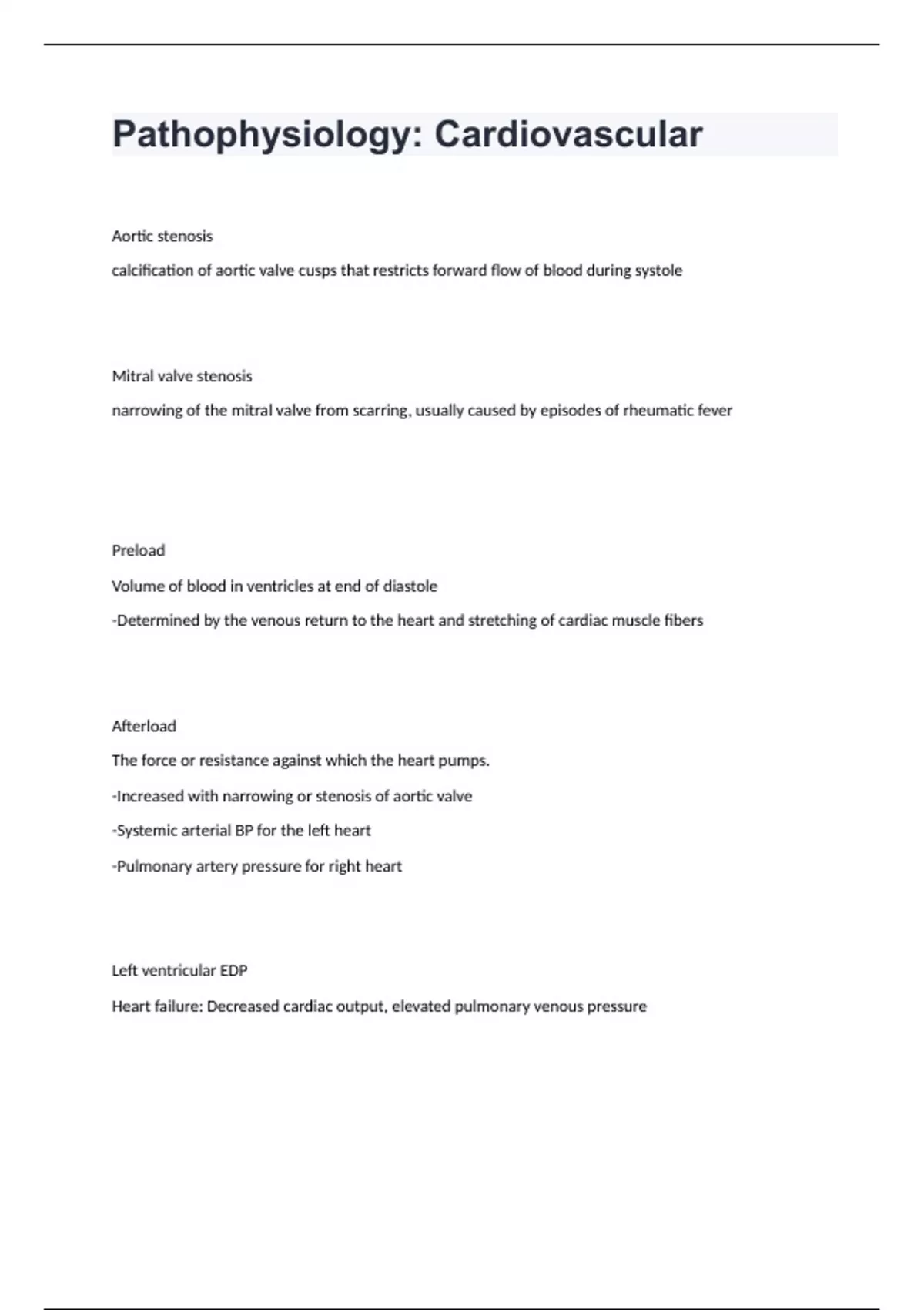 Pathophysiology: CardiovascularAortic stenosis calcification of aortic valve cusps that restricts forward flow of blood during systole Mitral valve stenosis narrowing of the mitral valve from scarring, usually caused by episodes of rheumatic fever Preload Volume of blood in ventricles at end of diastole -Determined by the venous return to the heart and stretching of cardiac muscle fibers Afterload The force or resistance against which the heart pumps. -Increased with narrowing or stenosis of aortic valve -Systemic arterial BP for the left heart -Pulmonary artery pressure for right heart Left ventricular EDP Heart failure: Decreased cardiac output, elevated pulmonary venous pressure