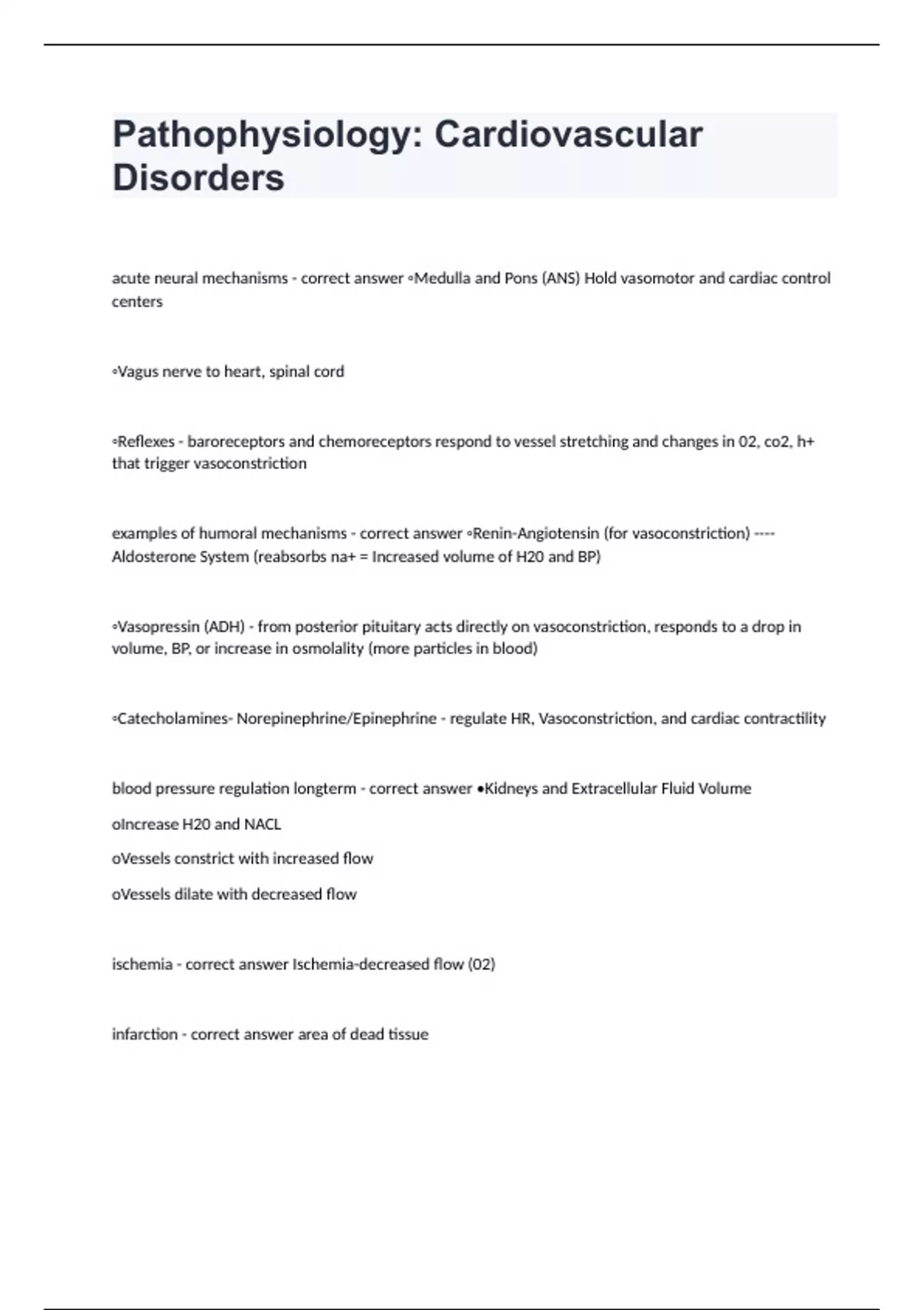 Pathophysiology: Cardiovascular Disordersacute neural mechanisms - correct answer ◦Medulla and Pons (ANS) Hold vasomotor and cardiac control centers ◦Vagus nerve to heart, spinal cord ◦Reflexes - baroreceptors and chemoreceptors respond to vessel stretching and changes in 02, co2, h+ that trigger vasoconstriction examples of humoral mechanisms - correct answer ◦Renin-Angiotensin (for vasoconstriction) ----Aldosterone System (reabsorbs na+ = Increased volume of H20 and BP) ◦Vasopressin (ADH) - from posterior pituitary acts directly on vasoconstriction, responds to a drop in volume, BP, or increase in osmolality (more particles in blood) ◦Catecholamines- Norepinephrine/Epinephrine - regulate HR, Vasoconstriction, and cardiac contractility blood pressure regulation longterm - correct answer •Kidneys and Extracellular Fluid Volume oIncrease H20 and NACL oVessels constrict with increased flow oVessels dilate with decreased flow