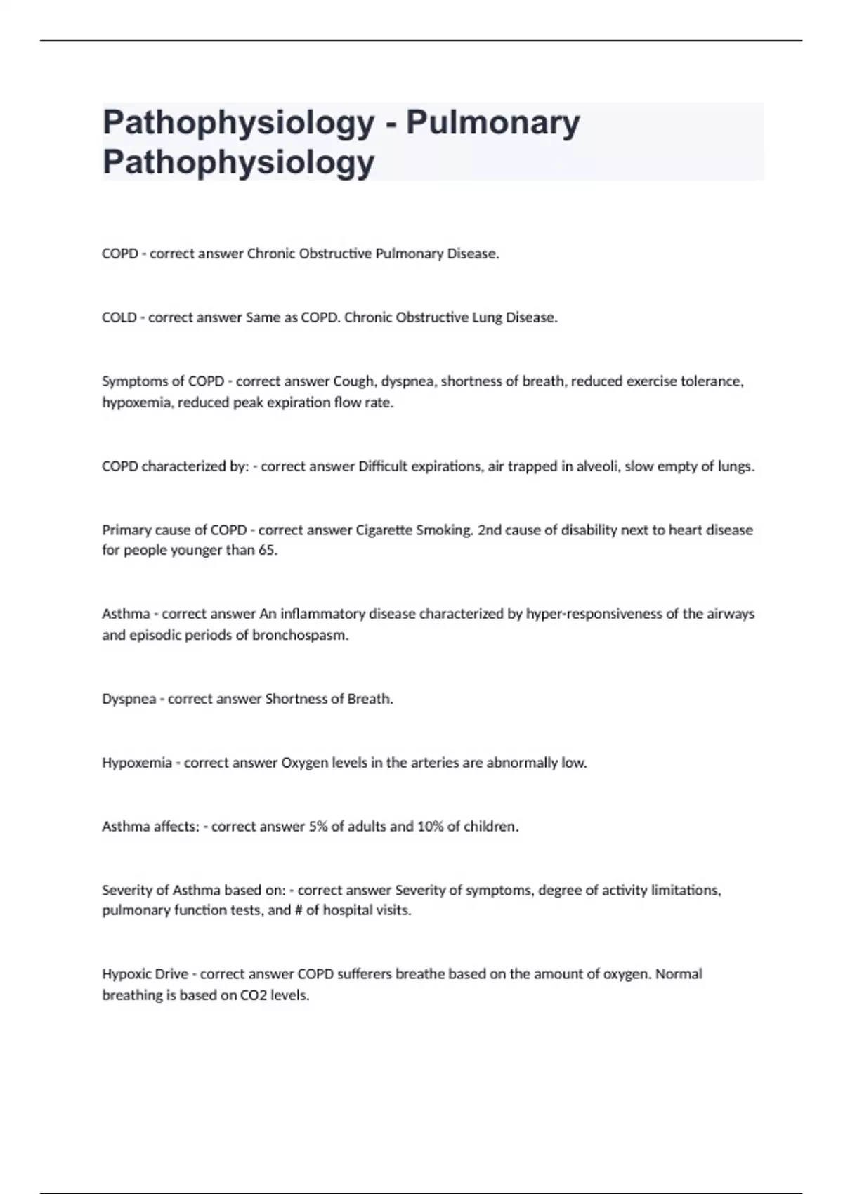 Pathophysiology - Pulmonary PathophysiologyCOPD - correct answer Chronic Obstructive Pulmonary Disease. COLD - correct answer Same as COPD. Chronic Obstructive Lung Disease. Symptoms of COPD - correct answer Cough, dyspnea, shortness of breath, reduced exercise tolerance, hypoxemia, reduced peak expiration flow rate. COPD characterized by: - correct answer Difficult expirations, air trapped in alveoli, slow empty of lungs. Primary cause of COPD - correct answer Cigarette Smoking. 2nd cause of disability next to heart disease for people younger than 65. Asthma - correct answer An inflammatory disease characterized by hyper-responsiveness of the airways and episodic periods of bronchospasm. Dyspnea - correct answer Shortness of Breath. Hypoxemia - correct answer Oxygen levels in the arteries are abnormally low. Asthma affects: - correct answer 5% of adults and 10% of children. Severity of Asthma based on: - correct answer Severity of symptoms, degree of activity limitations, pulmonary function tests, and # of hospital visits. Hypoxic Drive - correct answer COPD sufferers breathe based on the amount of oxygen. Normal breathing is based on CO2 levels.