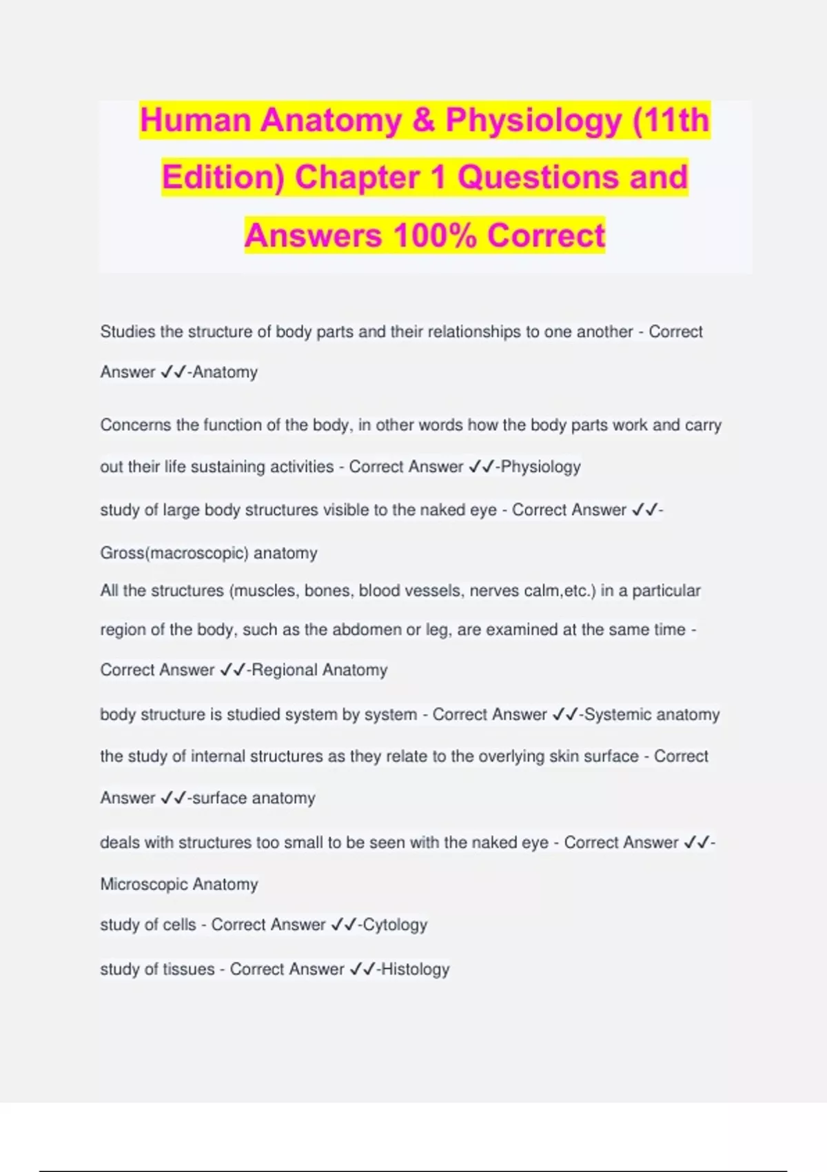 Human Anatomy & Physiology (11th Edition) Chapter 1 Questions and Answers 100% Correct Studies the structure of body parts and their relationships to one another - Correct Answer ️️ -Anatomy Concerns the function of the body, in other words how the body parts work and carry out their life sustaining activities - Correct Answer ️️ -Physiology study of large body structures visible to the naked eye - Correct Answer ️️ - Gross(macroscopic) anatomy All the structures (muscles, bones, blood vessels, nerves calm,etc.) in a particular region of the body, such as the abdomen or leg, are examined at the same time - Correct Answer ️️ -Regional Anatomy body structure is studied system by system - Correct Answer ️️ -Systemic anatomy the study of internal structures as they relate to the overlying skin surface - Correct Answer ️️ -surface anatomy deals with structures too small to be seen with the naked eye - Correct Answer ️️ - Microscopic Anatomy study of cells - Correct Answer ️️ -Cytology study of tissues - Correct Answer ️️ -Histology study of embryos and their development - Correct Answer ️️ -embryology study of structural changes caused by disease - Correct Answer ️️ -pathological anatomy studies internal structures as visualized by X-ray images or specialized scanning procedures - Correct Answer ️️ -radiographic anatomy feeling organs with your hands - Correct Answer ️️ -Palpation Listening to organ sounds with a stethoscope - Correct Answer ️️ -Auscultation concerns kidney function and urine production - Correct Answer ️️ -Renal Physiology explains the workings of the nervous system - Correct Answer ️️ -Neurophysiology examines the operation of the heart and blood vessels - Correct Answer ️️ - cardiovascular physiology function always reflects structure; what a structure can do depends on its specific form - Correct Answer ️️ -principle of complementarity of structure and function atoms combine to form molecules - Correct Answer ️️ -chemical level Building blocks of matter - Correct Answer ️️ -Atoms Groups of two or more atoms held together by chemical bonds - Correct Answer ️️ - Molecules A tiny cell structure that carries out a specific function within the cell - Correct Answer ️️ -organelles smallest unit of life - Correct Answer ️️ -Cells Groups of cells with a common structure and function - Correct Answer ️️ -Tissues cell, tissue, organ, organ system, organism - Correct Answer ️️ -Levels of organization the internal environment remains distinct from the external environment - Correct Answer ️️ -maintaining boundaries A selectively-permeable phospholipid bilayer forming the boundary of the cells - Correct Answer ️️ -plasma membrane fluid within cells - Correct Answer ️️ -intracellular fluid fluid outside the cell - Correct Answer ️️ -extracellu