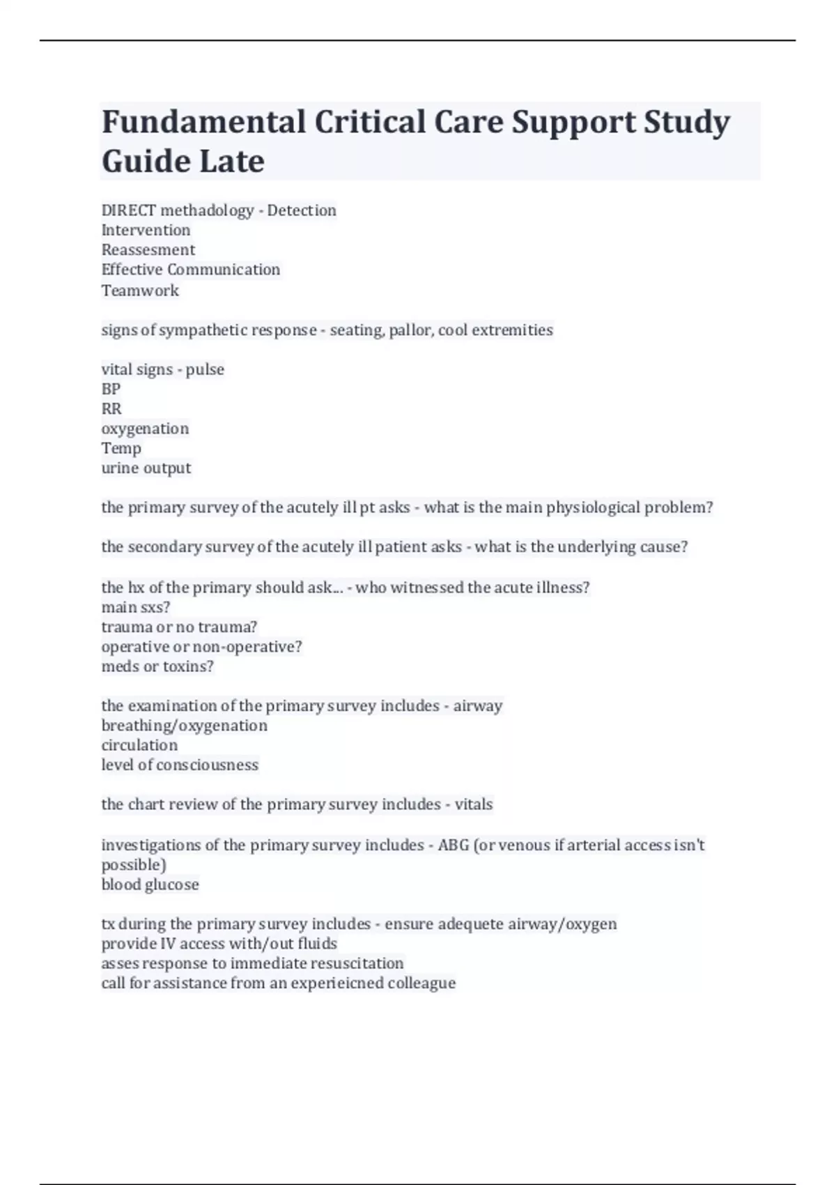 Fundamental Critical Care Support Study Guide Late DIRECT methadology - Detection Intervention Reassesment Effective Communication Teamwork signs of sympathetic response - seating, pallor, cool extremities vital signs - pulse BP RR oxygenation Temp urine output the primary survey of the acutely ill pt asks - what is the main physiological problem? the secondary survey of the acutely ill patient asks - what is the underlying cause? the hx of the primary should ask... - who witnessed the acute illness? main sxs? trauma or no trauma? operative or non-operative? meds or toxins? the examination of the primary survey includes - airway breathing/oxygenation circulation level of consciousness the chart review of the primary survey includes - vitals investigations of the primary survey includes - ABG (or venous if arterial access isn't possible) blood glucose tx during the primary survey includes - ensure adequete airway/oxygen provide IV access with/out fluids asses response to immediate resuscitation call for assistance from an experieicned colleague the data collection in the secondary survey can be described as - more detailed the single most important indicator of critical illness - tachypnea