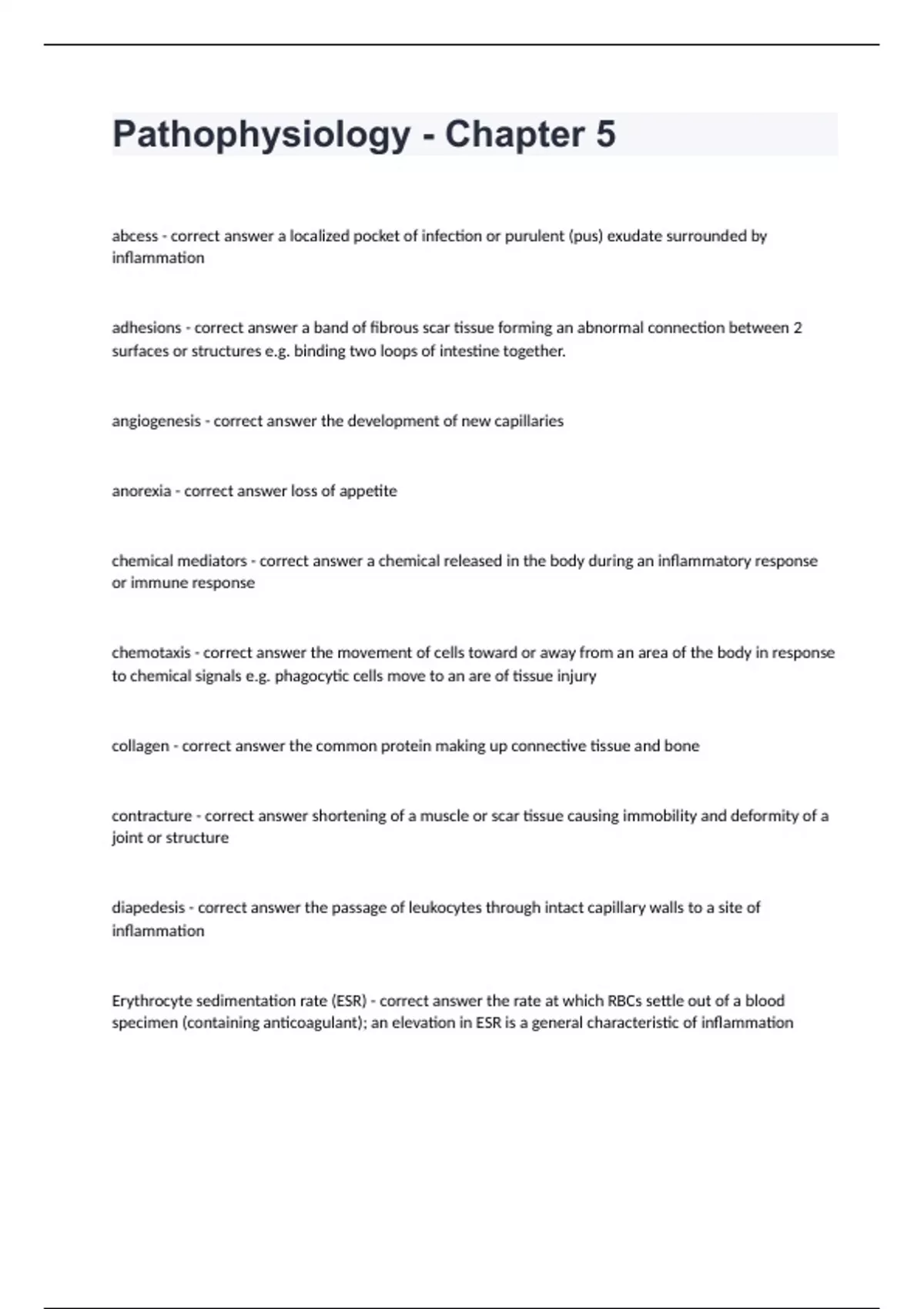 Pathophysiology - Chapter 5abcess - correct answer a localized pocket of infection or purulent (pus) exudate surrounded by inflammation adhesions - correct answer a band of fibrous scar tissue forming an abnormal connection between 2 surfaces or structures e.g. binding two loops of intestine together. angiogenesis - correct answer the development of new capillaries anorexia - correct answer loss of appetite chemical mediators - correct answer a chemical released in the body during an inflammatory response or immune response chemotaxis - correct answer the movement of cells toward or away from an area of the body in response to chemical signals e.g. phagocytic cells move to an are of tissue injury collagen - correct answer the common protein making up connective tissue and bone contracture - correct answer shortening of a muscle or scar tissue causing immobility and deformity of a joint or structure diapedesis - correct answer the passage of leukocytes through intact capillary walls to a site of inflammation Erythrocyte sedimentation rate (ESR) - correct answer the rate at which RBCs settle out of a blood specimen (containing anticoagulant); an elevation in ESR is a general characteristic of inflammation