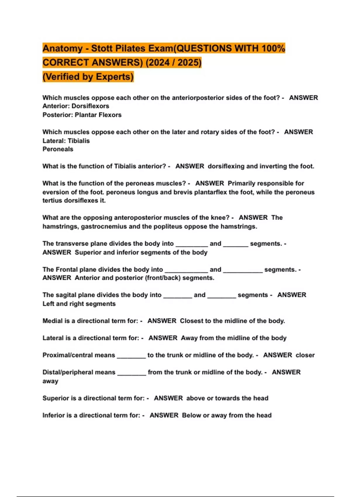 Anatomy - Stott Pilates Exam(QUESTIONS WITH 100% CORRECT ANSWERS) (2024 / 2025) (Verified by Experts)